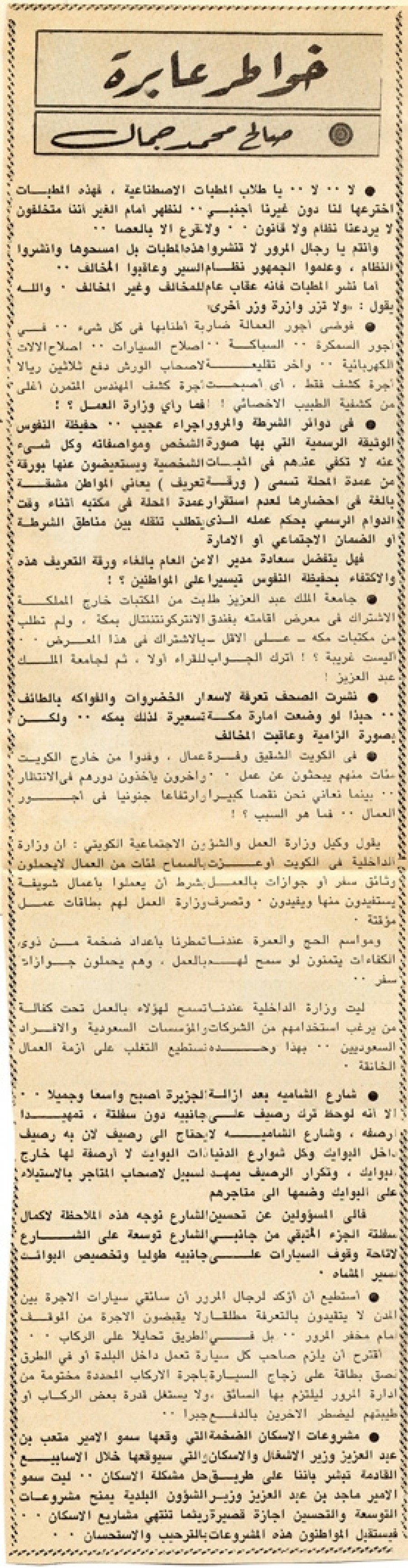 · فوضى أجور العمالة ضاربة أطنابها في كل شيء.. في أجور السمكرة.. السباكة.. إصلاح السيارات.. إصلاح الآلات الكهربائية.. وآخر تقليعة لأصحاب الورش دفع ثلاثين ريالا أجرة كشف فقط، أي أصبحت أجرة كشف المهندس المتمرن أغلى من كشفية الطبيب الأخصائي! فما رأي وزارة العمل؟!