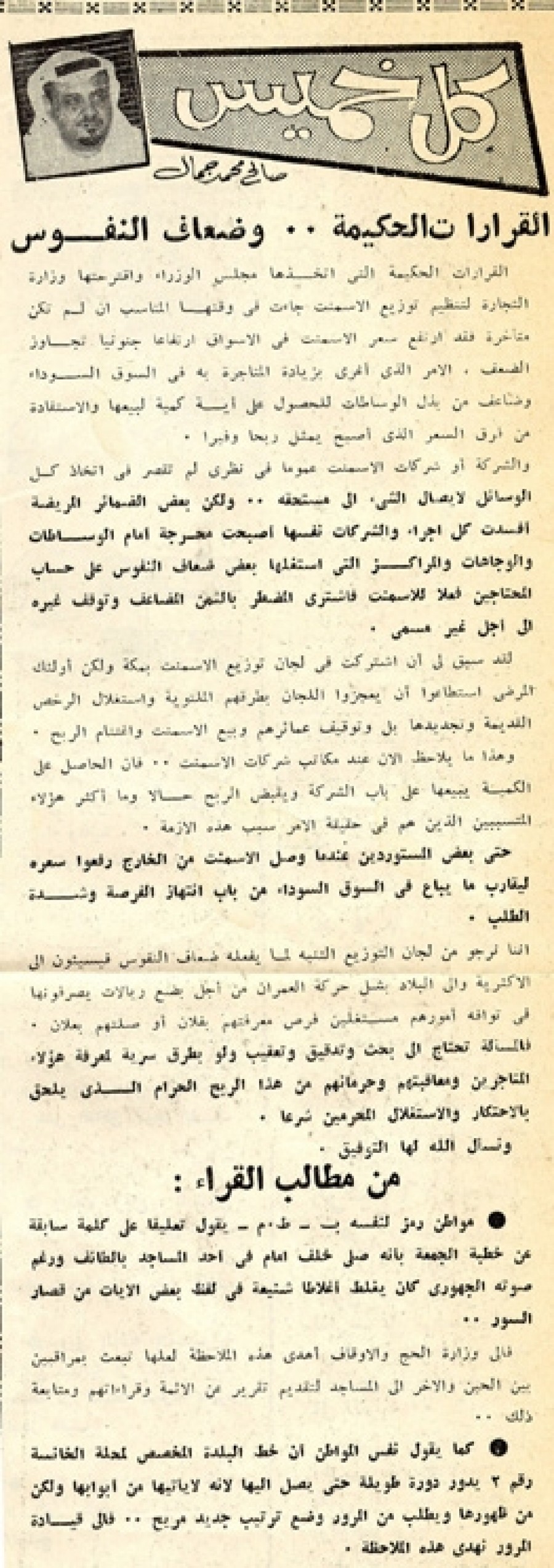 لقد سبق لي أن اشتركت في لجان توزيع الأسمنت بمكة ولكن أولئك المرضى استطاعوا أن يعجزوا اللجان بطرقهم الملتوية واستغلال الرخص القديمة وتجديدها بل وتوقيف عمائرهم وبيع الأسمنت واغتنام الربح.