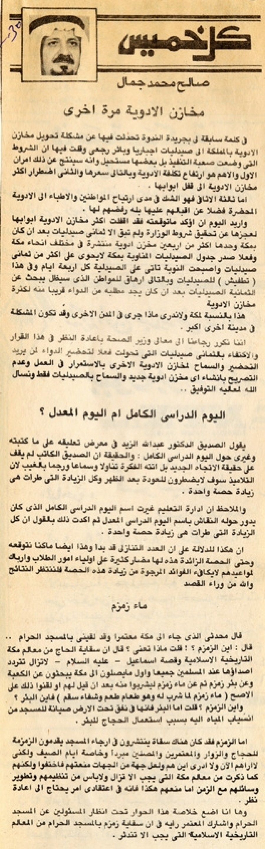 أما الزمزم فقد كان هناك سقاة ينتشرون في أرجاء المسجد يقدمون الزمزمة للحجاج والزوار والمعتمرين والمصلين مبرداً وخاصة أيام الصيف ولكني لا أراهم الآن ولا أدري أين هم ولعل جهة من الجهات منعتهم فاختفوا ولكنهم كما ذكرت من معالم مكة التي يجب ألا تزال ولا بأس من تنظيمهم وتطوير وسائلهم مع الزمن أما منعهم هكذا فإنه في اعتقادي أمر يحتاج إلى إعادة نظر.