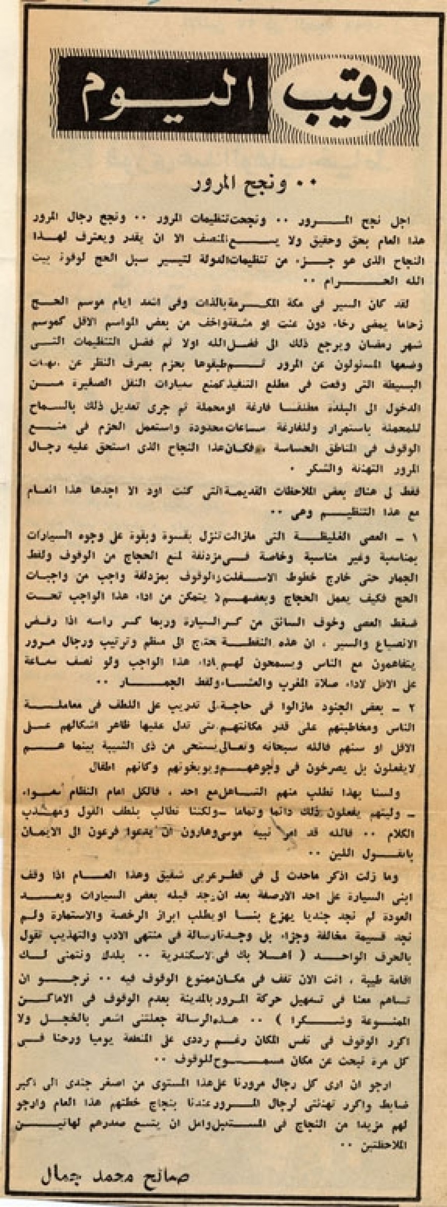 أرجو أن أرى كل رجال مرورنا على هذا المستوى من أصغر جندي إلى أكبر ضابط وأكرر تهنئتي لرجال المرور عندنا بنجاح خطتهم هذا العام وأرجو لهم مزيدا من النجاح في المستقبل وآمل أن يتسع صدرهم لهاتين الملاحظتين..
