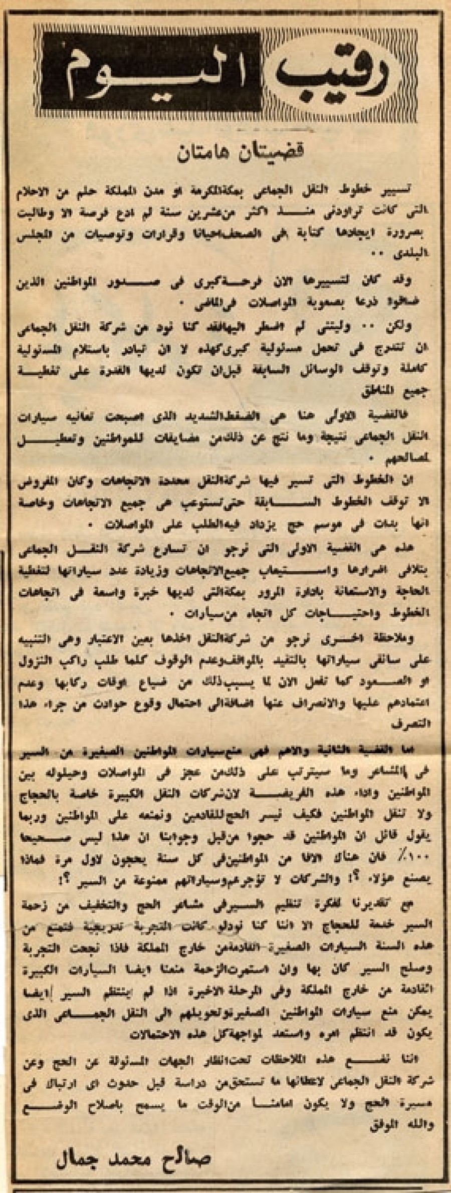 هذه هي القضية الأولى التي نرجو أن تسارع شركة النقل الجماعي بتلافي أضرارها واستيعاب جميع الاتجاهات وزيادة عدد سياراتها لتغطية الحاجة والاستعانة بإدارة المرور بمكة التي لديها خبرة واسعة في اتجاهات الخطوط واحتياجات كل اتجاه من سيارات.