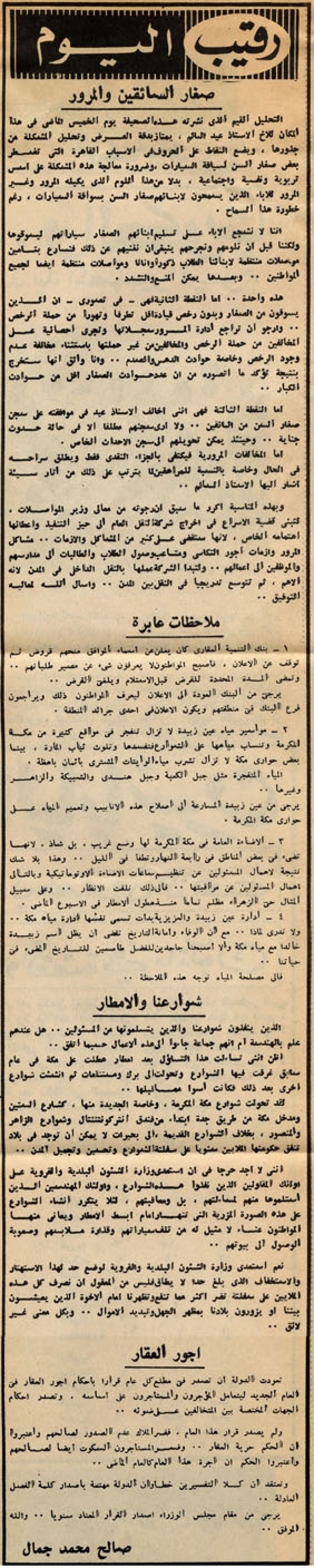 إنني لا أجد حرجاً في أن أستعدى وزارة الشئون البلدية والقروية على أولئك المقاولين الذين نفذوا هذه الشوارع، وأولئك المهندسين الذين استلموها منهم لمساءلتهم، بل ومعاقبتهم، لئلا يتكرر إنشاء الشوارع على هذه الصورة المزرية التي تنهار أمام أبسط الأمطار ويعانى منها المواطنون عناء لا مثيل له من تلف سياراتهم وقذارة ملابسهم وصعوبة الوصول إلى بيوتهم..