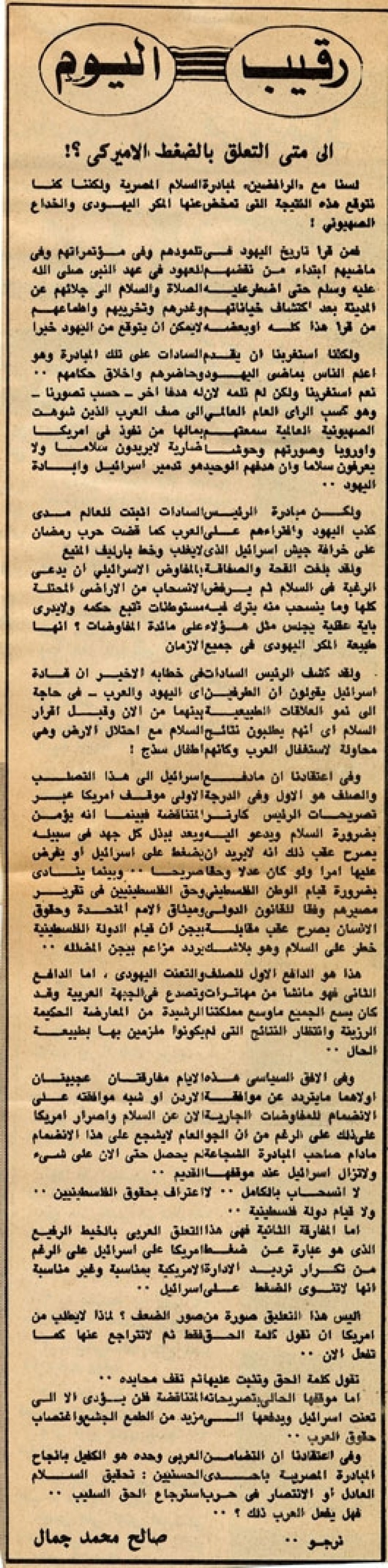 وفي اعتقادنا أن ما دفع إسرائيل إلى هذا التصلب والصلف هو الأول وفي الدرجة الأولى موقف أمريكا عبر تصريحات الرئيس كارتر المتناقضة فبينما أنه يؤمن بضرورة السلام ويدعو إليه ويعد ببذل كل جهد في سبيله يصرح عقب ذلك أنه لا يريد أن يضغط على إسرائيل أو يفرض عليها أمراً ولو كان عدلاً وحقاً صريحاً.. وبينما ينادى بضرورة قيام الوطن الفلسطيني وحق الفلسطينيين في تقرير مصيرهم وفقاً للقانون الدولي وميثاق الأمم المتحدة وحقوق الإنسان يصرح عقب مقابلة بيجن أن قيام الدولة الفلسطينية خطر على السلام وهو بلا شك يردد مزاعم بيجن المضللة..