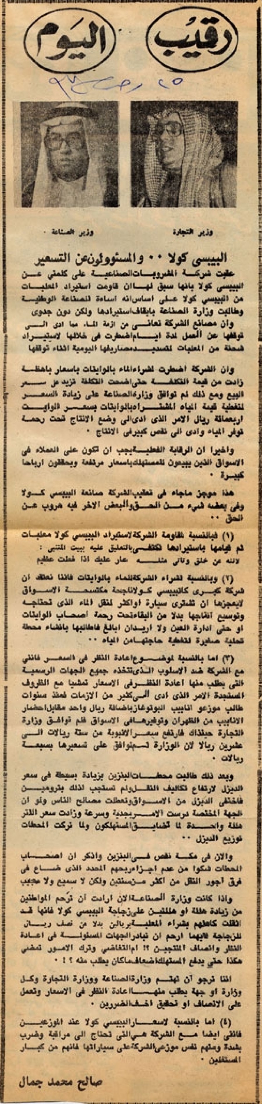* الحديث الصحفي الذي نشرته جريدة البلاد الغراء عن عمد المحلات وما يقومون به من خدمات لمحلاتهم ذكرني بأوضاع هؤلاء الجنود المجهولين وضرورة تحسين أوضاعهم لتمكينهم من أداء خدمات أفضل وأكثر.. وخاصة بعد أن اتسعت أعمالهم وتزايد عدد سكان المحلات.. ليت سعادة مدير الأمن العام يذكرهم الآن بعد ذكر الجنود والضباط ويطالب بتحسين رواتبهم وأوضاعهم وصلاحياتهم ضمن كادر الموظفين الجديد.