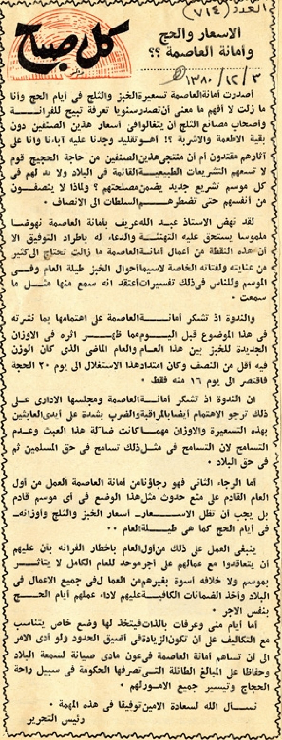 لقد نهض الأستاذ عبد الله عريف بأمانة العاصمة نهوضاً ملموساً يستحق عليه التهنئة والدعاء له باطراد التوفيق إلا أن هذه النقطة من أعمال أمانة العاصمة مازالت تحتاج إلي كثير من عنايته ولفتاته الخاصة لاسيماً أحوال الخبز طيلة العام وفي الموسم وللناس في ذلك تفسيرات أعتقد أنه سمع منها مثل ما سمعت.