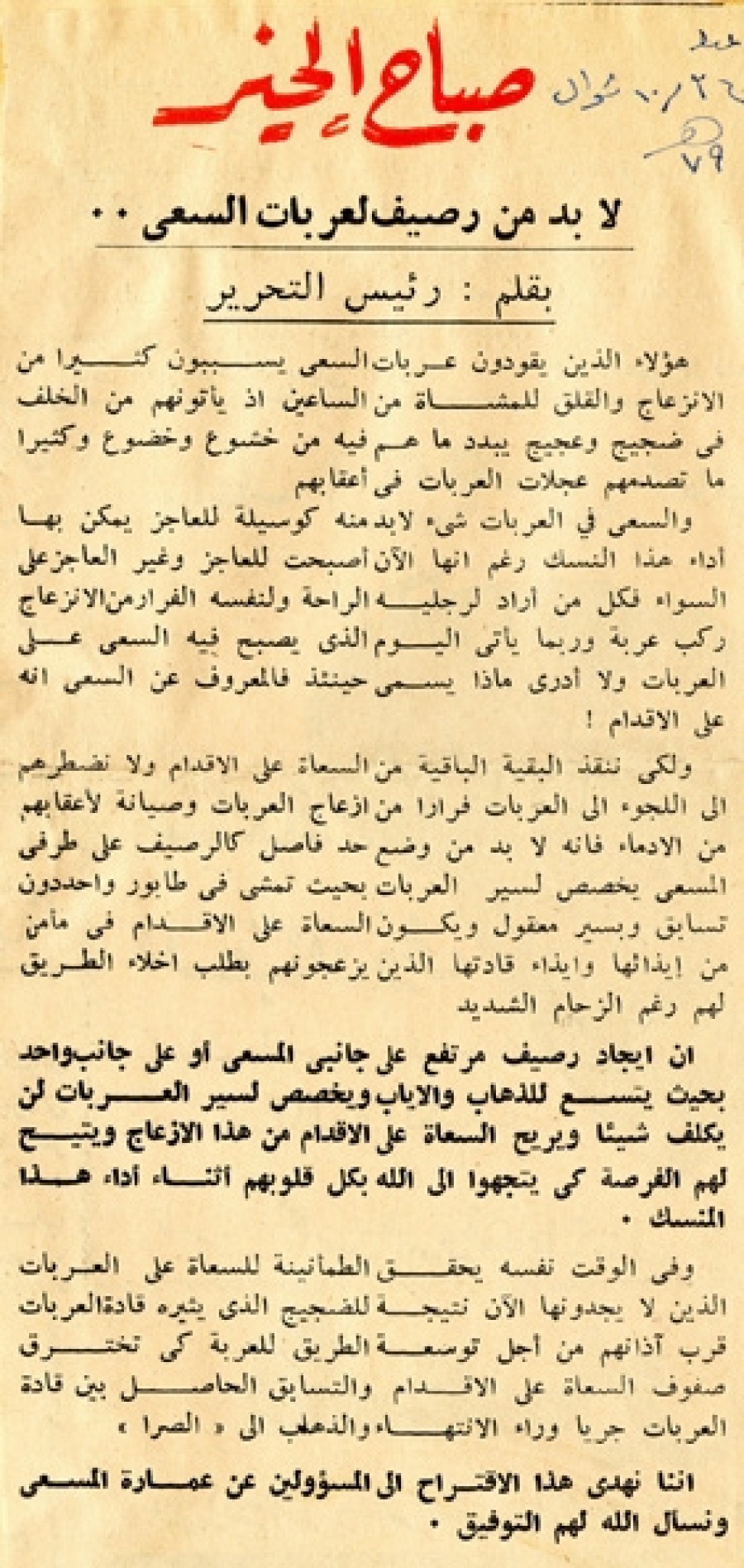 ولكي ننقذ البقية الباقية من السعاة على الأقدام ولا نضطرهم إلي اللجوء إلي العربات فراراً من إزعاج العربات وصيانة لأعقابهم من الإدماء فإنه لابد من وضع حد فاصل كالرصيف على طرفي المسعى يخصص لسير العربات بحيث تمشي في طابور واحد دون تسابق وبسير معقول ويكون السعاة على الأقدام في مأمن من إيذائها وإيذاء قادتها الذين يزعجونهم بطلب إخلاء الطريق لهم رغم الزحام الشديد.