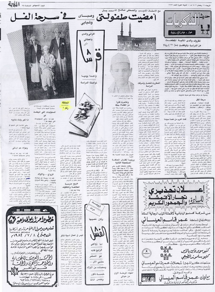 أبنائي طارق وحسن وياسر معينون في كلية الطب بجامعة الملك عبد العزيز بجدة يكملون الآن دراستهم العليا في بريطانيا على وشك الانتهاء.. وابني فايز يدرس الاقتصاد والإدارة بجامعة الملك عبد العزيز أيضاً.. وآخر العنقود ماهر وقد حصل هذا العام على الشهادة الابتدائية، أما البنات فثلاث قد تخرجن من الجامعات وواحدة في السنة قبل النهائية بجامعة أم القرى أما الأخيرة فإنها في المرحلة الثانوية.