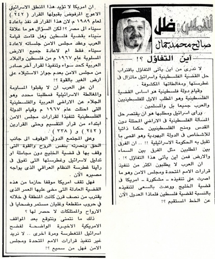 إن العرب لا يطلبون أكثر من تنفيذ قرارات الأمم المتحدة ومجلس الأمن وهو ما أصرت على تنفيذه – مشكورة – أمريكا في قضية الخليج ووعدت بالسعي لتنفيذه بالنسبة لقضية فلسطين فلماذا العدول الآن عن الخط المستقيم؟!