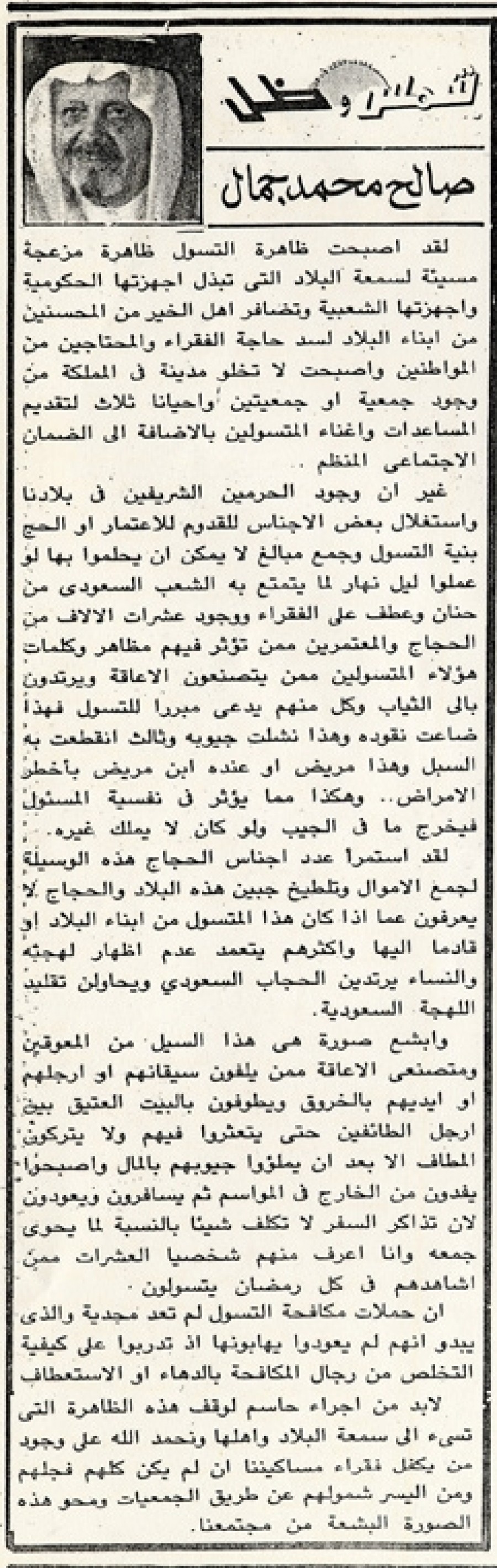 لقد أصبحت ظاهرة التسول ظاهرة مزعجة مسيئة لسمعة البلاد التي تبذل أجهزتها الحكومية وأجهزتها الشعبية وتضافر أهل الخير من المحسنين من أبناء البلاد لسد حاجة الفقراء والمحتاجين من المواطنين وأصبحت لا تخلو مدينة في المملكة من وجود جمعية أو جمعيتين أو أحيانا ثلاث لتقديم المساعدات وإغناء المتسولين بالإضافة إلى الضمان الاجتماعى المنظم.