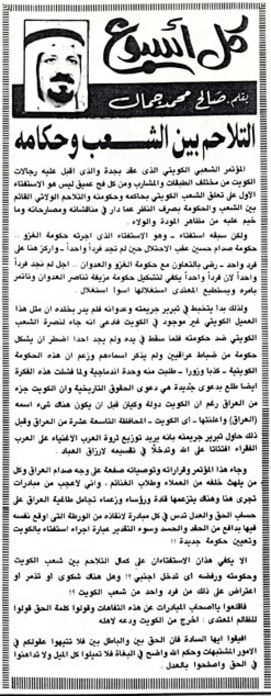 وجاء هذا المؤتمر وقراراته وتوصياته صفعة على وجه صدام العراق وكل من يلهث خلفه من العملاء وطلاب الغنائم، وأني لأعجب من مبادرات تجري هنا وهناك يتزعمها قادة ورؤساء وزعماء تجامل طاغية العراق على حساب الحق والعدل تدس في كل مبادرة لإنقاذه من الورطة التي أوقع نفسه فيها بدافع من الحقد والحسد وسوء التقدير عبارة إجراء استفتاء بالكويت وتعيين حكومة جديدة!!