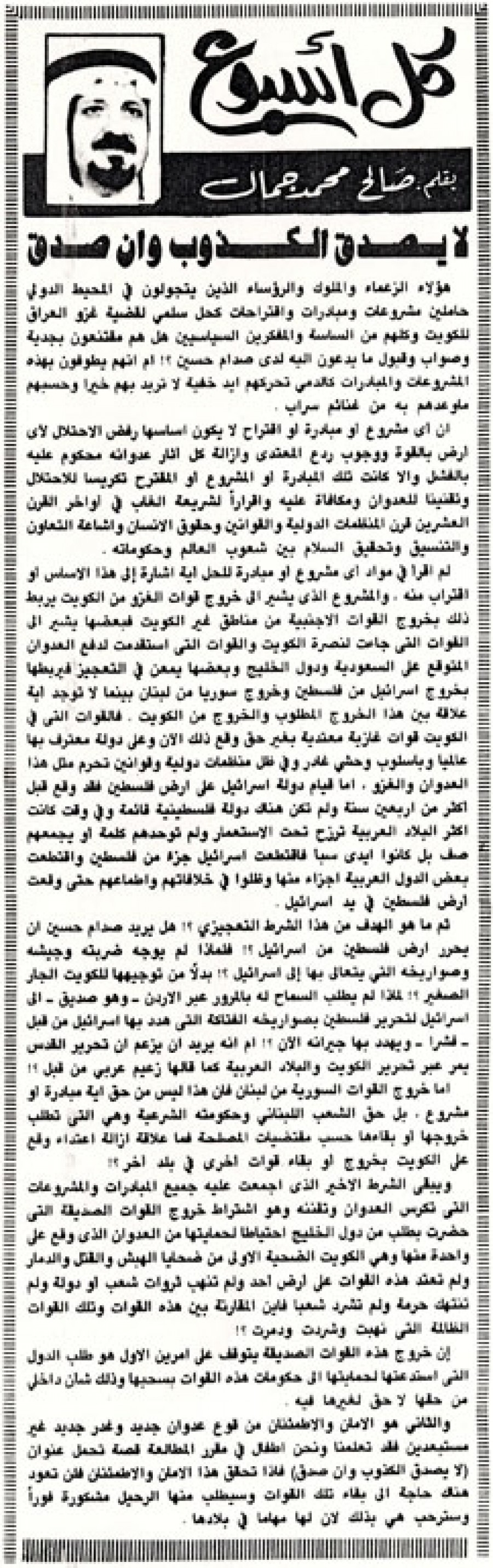أما خروج القوات السورية من لبنان فإن هذا ليس من حق أية مبادرة أو مشروع. بل حق الشعب اللبناني وحكومته الشرعية وهي التي تطلب خروجها أو بقاءها حسب مقتضيات المصلحة فما علاقة إزالة إعتداء وقع على الكويت بخروج أو بقاء قوات أخري في بلد آخر؟!