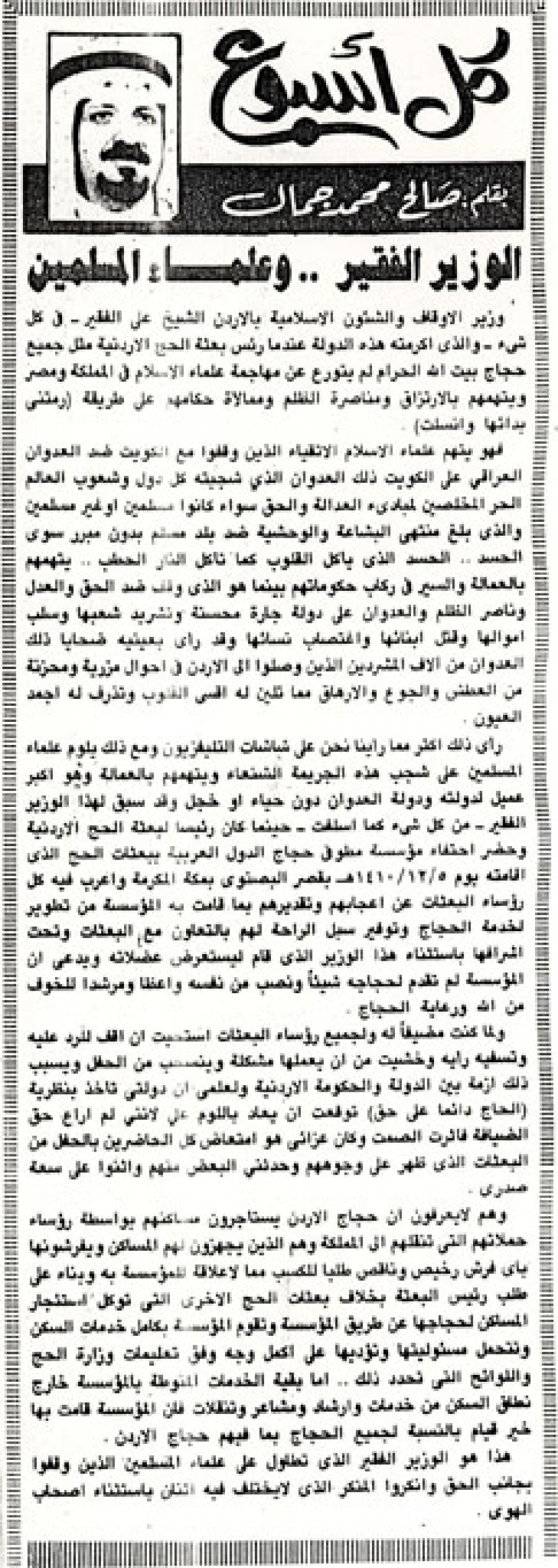 رأي ذلك أكثر مما رأينا نحن على شاشات التليفزيون ومع ذلك يلوم علماء المسلمين على شجب هذه الجريمة الشنعاء ويتهمهم بالعمالة وهو أكبر عميل لدولته ودولة العدوان دون حياء أو خجل وقد سبق لهذا الوزير الفقير -من كل شيء كما أسلفت- حينما كان رئيسا لبعثة الحج الأردنية وحضر إحتفاء مؤسسة مطوفي حجاج الدول العربية ببعثات الحج الذي إقامته يوم 5/2/1410 ﻫ بقصر البصنوي بمكة المكرمة وأعرب فيه كل رؤساء البعثات عن إعجابهم وتقديرهم بما قامت به المؤسسة من تطوير لخدمة الحجاج وتوفير سبل الراحة لهم بالتعاون مع البعثات وتحت إشرافها باستثناء هذا الوزير الذي قام ليستعرض عضلاته ويدعي أن المؤسسة لم تقدم لحجاجه شيئاً ونصب من نفسه واعظاً ومرشداً للخوف من الله ورعاية الحجاج.