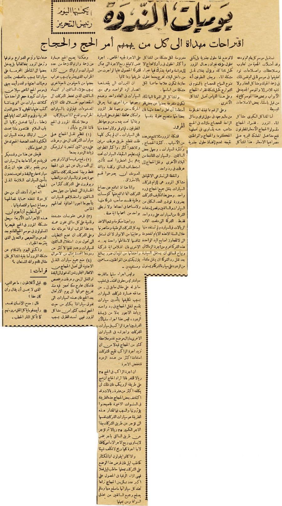 وعلى الرغم مما تبذله الحكومة من مال وجهد في سبيل توفير وسائل الراحة للحجاج ما زالت في الحج متاعب جمة يتساوى في تحملها الحكومة والحجاج والمواطنين نتيجة لعدم اتخاذ حلول جذرية مدروسة لكل مشكلة من المشاكل وأكثر الحلول في رأي لا تحتاج إلا إلى دراسة واعية يشترك فيها خبراء من داخل البلاد تخرج بعدها بحلول حازمة تكون علاجاً حاسماً لكل مشكلة من أساسها.