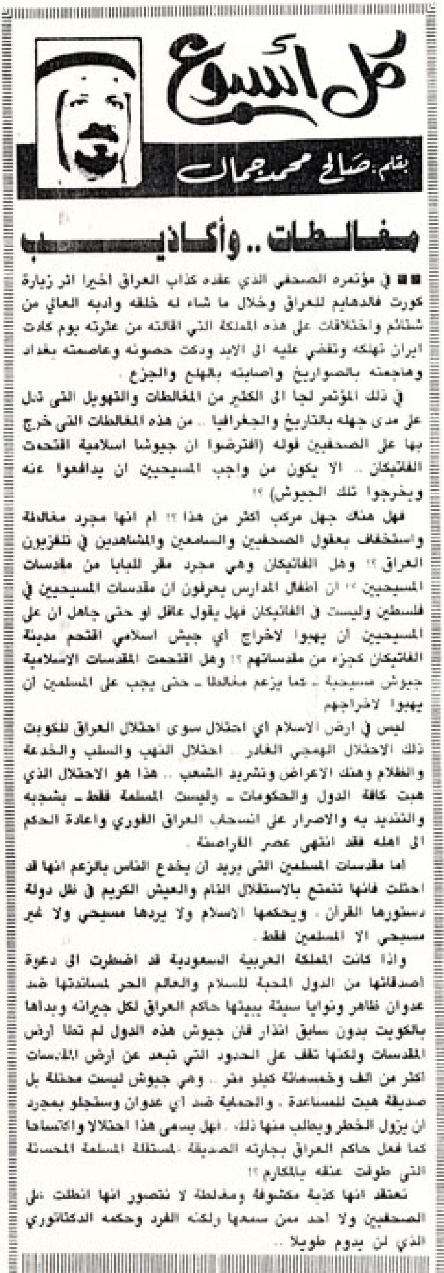 فهل هناك جهل مركب أكثر من هذا؟! أم أنها مجرد مغالطة واستخفاف بعقول الصحفيين والسامعين والمشاهدين في تلفزيون العراق؟! وهل الفاتيكان وهي مجرد مقر للبابا من مقدسات المسحيين؟! إن أطفال المدارس يعرفون أن مقدسات المسيحيين في فلسطين وليست في الفاتيكان فهل يقول عاقل أو حتى جاهل أن على المسيحيين أن يهبوا لإخراج أي جيش إسلامي اقتحم مدينة الفاتيكان كجزء من مقدساتهم؟ وهل اقتحمت المقدسات الإسلامية جيوش مسيحية - كما يزعم مغالطاً - حتى يجب على المسلمين أن يهبوا لإخراجهم.