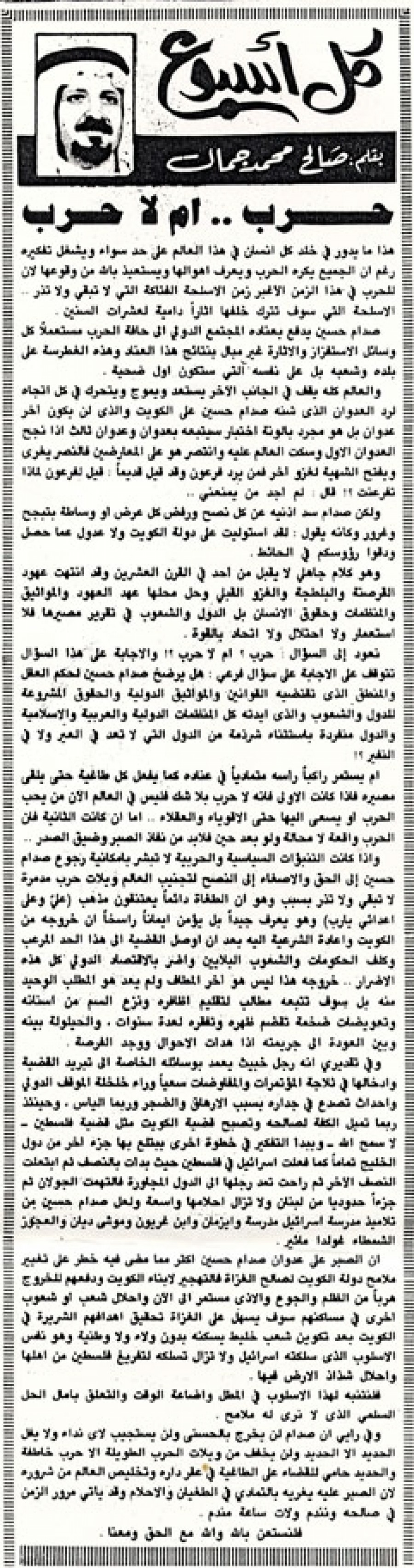 نعود إلي السؤال: حرب؟ أم لا حرب؟! والإجابة على هذا السؤال تتوقف على الإجابة على سؤال فرعي: هل يرضخ صدام حسين لحكم العقل والمنطق الذي تقتضيه القوانين والمواثيق الدولية والحقوق المشروعة للدول والشعوب والذي أيدته كل المنظمات الدولية والعربية والإسلامية والدول منفردة باستثناء شرذمة من الدول التي لا تعد في العير ولا في النفير؟!