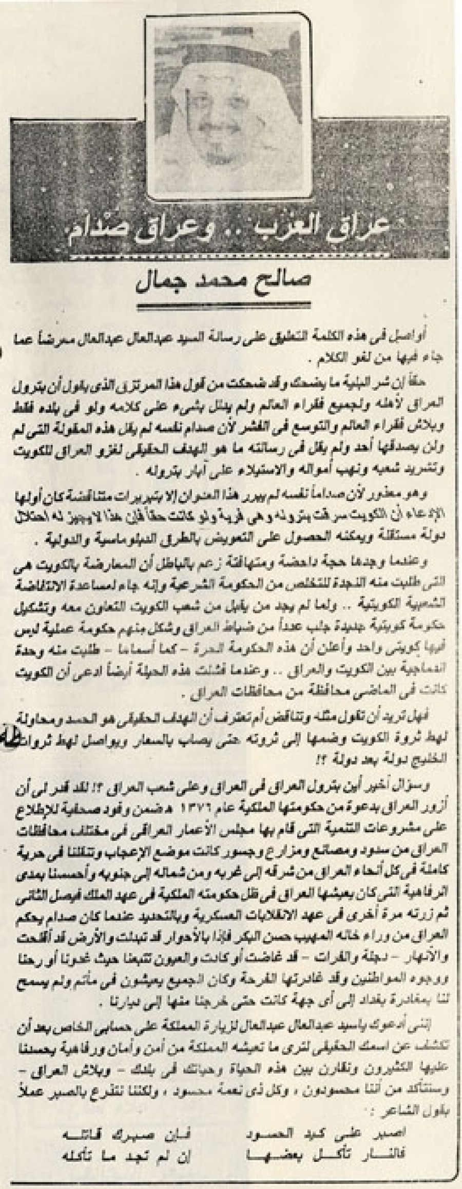 وسؤال أخير أين بترول العراق في العراق وعلى شعب العراق؟! لقد قدر لي أن أزور العراق بدعوة من حكومتها الملكية عام 1376 ﻫ ضمن وفود صحفية للاطلاع على مشروعات التنمية التي قام بها مجلس الأعمار العراقي في مختلف محافظات العراق من سدود ومصانع ومزارع وجسور كانت موضع الإعجاب وتنقلنا في حرية كاملة في كل أنحاء العراق من شرقه إلي غربه ومن شماله إلي جنوبه وأحسسنا بمدي الرفاهية التي كان يعيشها العراق في ظل حكومته الملكية في عهد الملك فيصل الثاني ثم زرته مرة أخري في عهد الانقلابات العسكرية وبالتحديد عندما كان صدام يحكم العراق من وراء خاله المهيب حسن البكر فإذا بالأحوار قد تبدلت والأرض قد أقلحت والأنهار- دجلة والفرات- قد غاضت أو كادت والعيون تتبعنا حيث غدونا أو رحنا ووجوه المواطنين وقد غادرتها الفرحة وكان الجميع يعيشون في مأتم ولم يسمح لنا بمغادرة بغداد إلي أي جهة كانت حتى خرجنا منها إلي ديارنا.