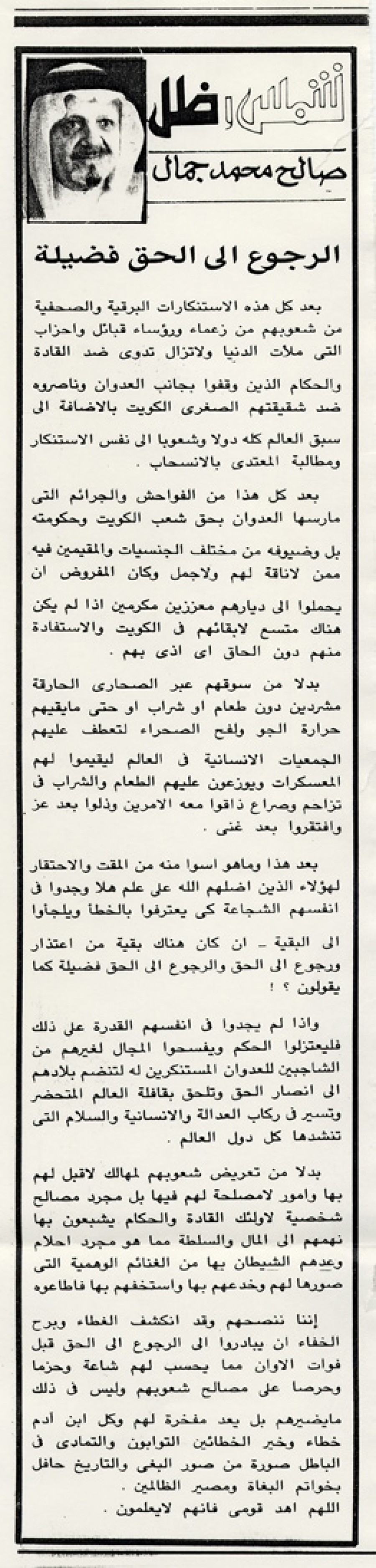 بعد كل هذه الاستنكارات البرقية والصحفية من شعوبهم من زعماء ورؤساء قبائل وأحزاب التي ملأت الدنيا ولا تزال تدوي ضد القادة والحكام الذين وقفوا بجانب العدوان وناصروه ضد شقيقتهم الصغرى الكويت بالإضافة إلى سبق العالم كله دولا وشعوبا إلى نفس الاستنكار ومطالبة المعتدي بالانسحاب.