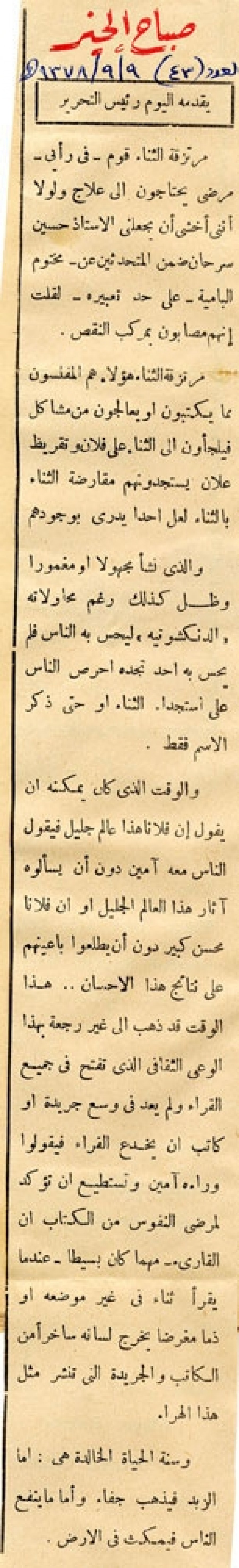 والوقت الذي كان يمكنه أن يقول إن فلاناً هذا عالم جليل فيقول الناس معه آمين دون أن يسألوه آثار هذا العالم الجليل أو أن فلاناً محسن كبير دون أن يطلعوا بأعينهم على نتائج هذا الإحسان .. هذا الوقت قد ذهب إلى غير رجعة بهذا الوعي الثقافي الذي تفتح في جميع القراء ولم يعد في وسع جريدة أو كاتب أن يخدع القراء فيقولوا وراءه آمين وتستطيع أن تؤكد لمرضى النفوس من الكتاب أن القارئ – مهما كان بسيطاً – عندما يقرأ ثناء في غير موضعه أو ذماً مغرضاً يخرج لسانه ساخراً من الكاتب والجريدة التي تنشر مثل هذا الهراء.