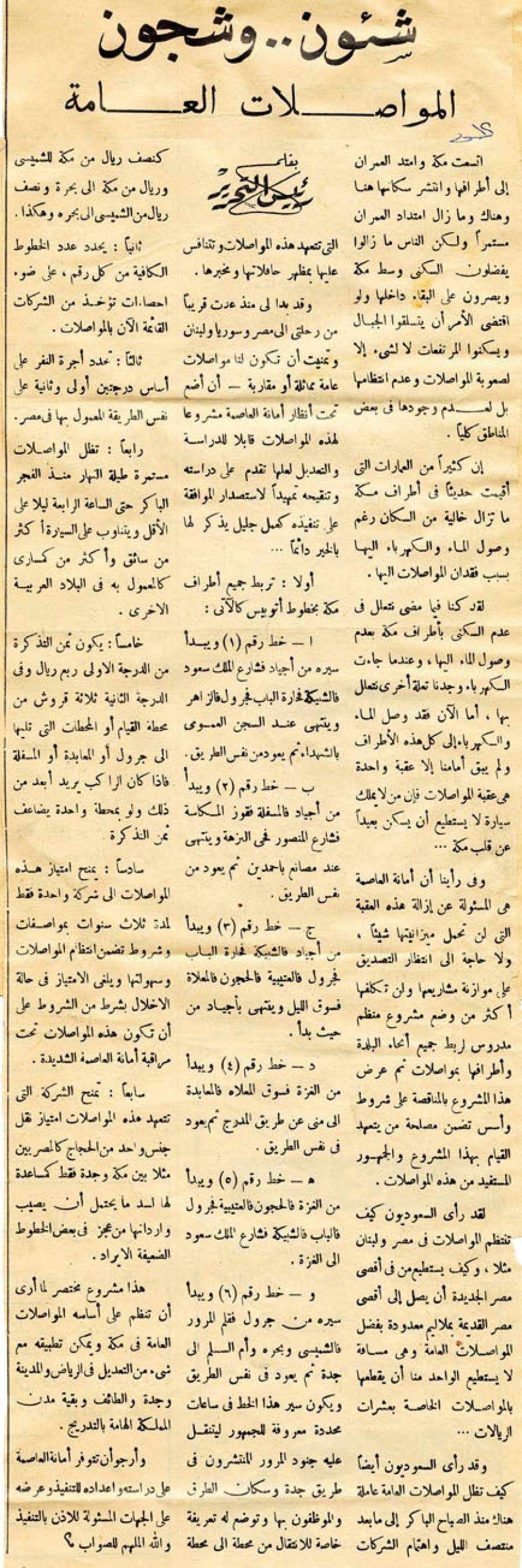 هذا مشروع مختصر لما أرى أن تنظم على أساسه المواصلات العامة في مكة ويمكن تطبيقه مع شيء من التعديل في الرياض والمدينة وجدة والطائف وبقية مدن المملكة الهامة بالتدريج. وأرجو أن تتوفر أمانة العاصمة على دراسته وإعداده للتنفيذ وعرضه على الجهات المسئولة للإذن بالتنفيذ والله الملهم للصواب.