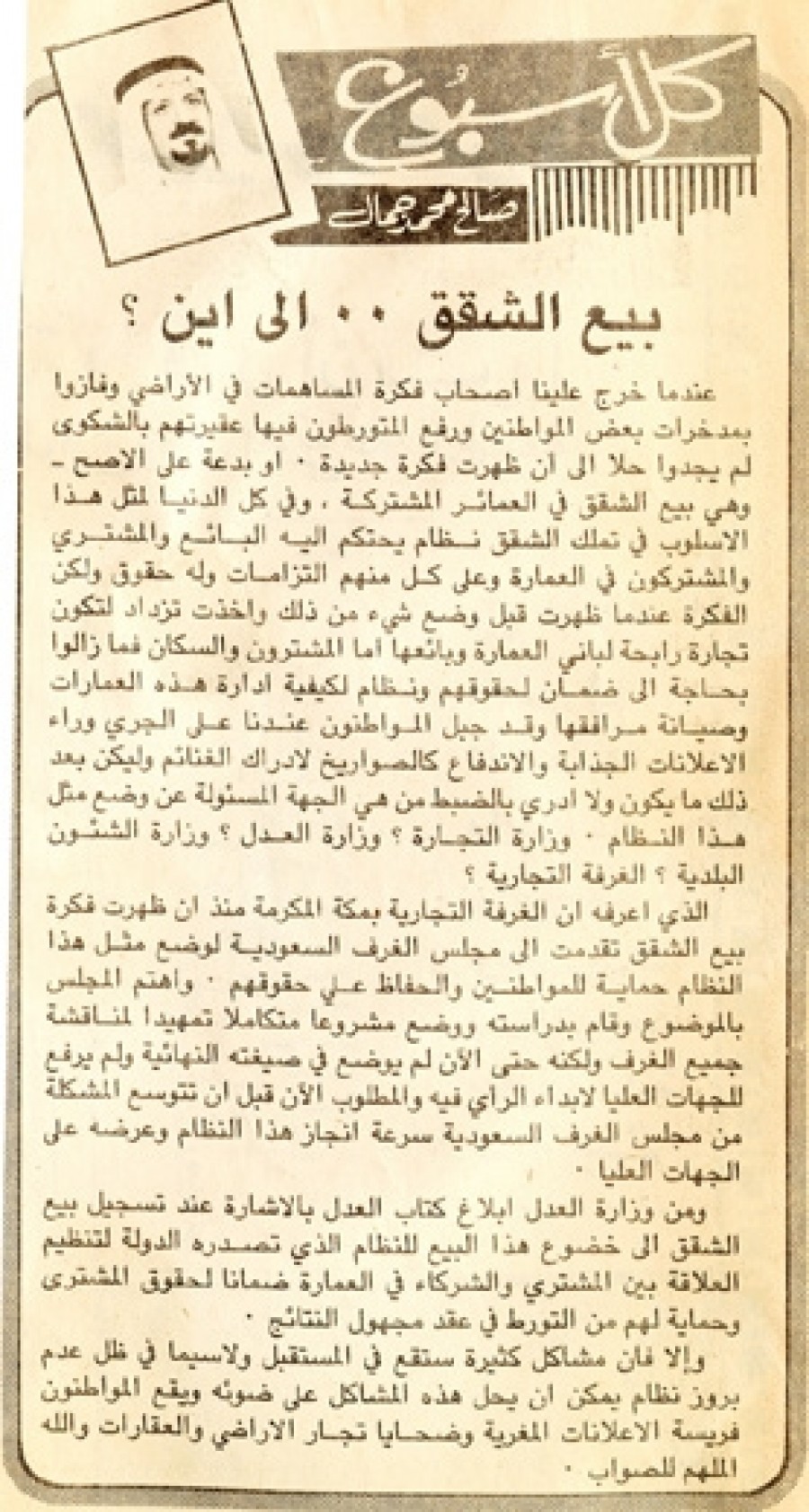 عندما خرج علينا أصحاب فكرة المساهمات في الأراضي وفازوا بمدخرات بعض المواطنين ورفع المتورطون فيها عقيرتهم بالشكوى لم يجدوا حلا إلى أن ظهرت فكرة جديدة. أو بدعة على الأصح – وهي بيع الشقق في العمائر المشتركة، وفي كل الدنيا لمثل هذا الأسلوب في تملك الشقق نظام يحتكم إليه البائع والمشتري والمشتركون في العمارة وعلى كل منهم التزامات وله حقوق ولكن الفكرة عندما ظهرت قبل وضع شئ من ذلك وأخذت تزداد لتكون تجارة رابحة لباني العمارة وبائعها أما المشترون والسكان فما زالوا بحاجة إلى ضمان لحقوقهم ونظام لكيفية إدارة هذه العمارات وصيانة مرافقها وقد جبل المواطنون عندنا على الجري وراء الإعلانات الجذابة والاندفاع كالصواريخ لإدراك الغنائم وليكن بعد ذلك ما يكون ولا أدري بالضبط من هي الجهة المسئولة عن وضع مثل هذا النظام. وزارة التجارة؟ وزارة العدل؟ وزارة الشئون البلدية؟ الغرفة التجارية؟