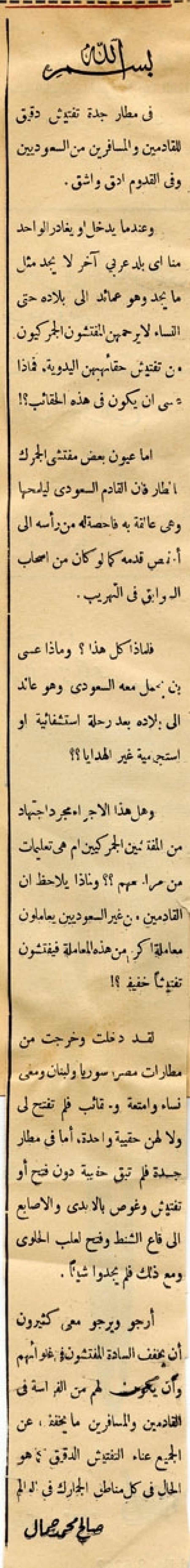 لقد دخلت وخرجت من مطارات مصر، وسوريا ولبنان ومعي نساء وأمتعة وحقائب فلم تفتح لي ولا لهن حقيبة واحدة، أما في مطار جدة فلم تبقى حقيبة دون فتح أو تفتيش وغوص بالأيدي والأصابع إلى قاع الشنط وفتح لعلب الحلوى ومع ذلك فلم يجدوا شيئاً.