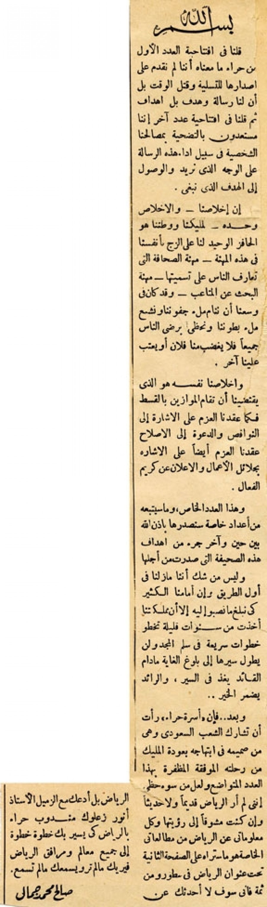 وبعد.. فإن «أسرة حراء» رأت أن تشارك الشعب السعودي وهي من صميمه في ابتهاجه بعودة المليك من رحلته الموفقة المظفرة بهذا العدد المتواضع ولعل من سوء حظي إنني لم أر الرياض قديماً ولا حديثاً وإن كنت مشوقاً إلى رؤيتها وكل معلوماتي عن الرياض من مطالعاتي الخاصة هو ما ستراه على الصفحة الثانية تحت عنوان الرياض في سطور ومن ثمة فإني سوف لا أحدثك عن الرياض بل أدعك مع الزميل الأستاذ أنور زعلوك مندوب حراء بالرياض كي يسير بك خطوة خطوة إلى جميع معالم ومرافق الرياض فيريك ما لم تر ويسمعك ما لم تسمع.