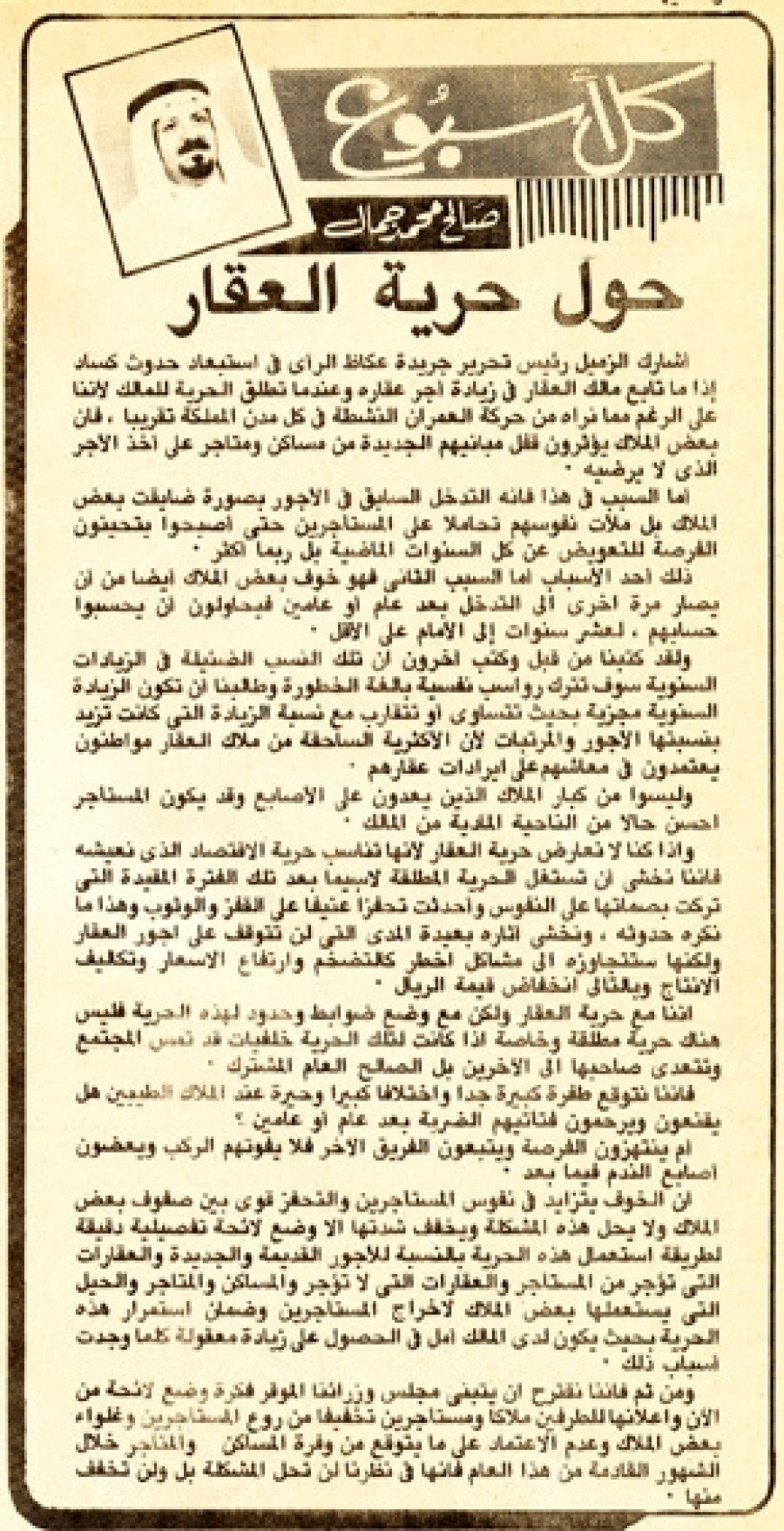 وإذا كنا لا نعارض حرية العقار لأنها تناسب حرية الاقتصاد الذي نعيشه فإننا نخشى أن تستغل الحرية المطلقة لاسيما بعد تلك الفترة المقيدة التي تركت بصماتها على النفوس وأحدثت تحفزا عنيفا على القفز والوثوب وهذا ما نكره حدوثه، ونخشى آثاره بعيدة المدى التي لن تتوقف على أجور العقار ولكنها ستتجاوزه إلى مشاكل أخطر كالتضخم وارتفاع الأسعار وتكاليف الإنتاج وبالتالي انخفاض قيمة الريال.