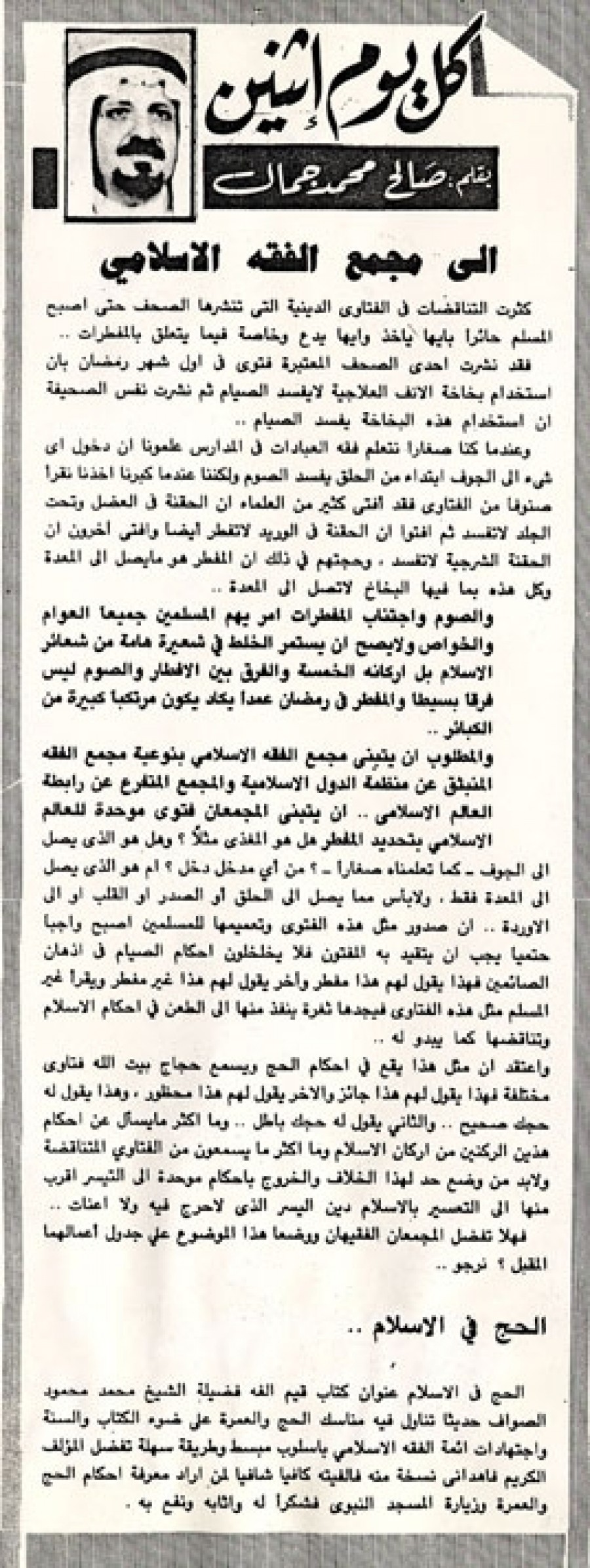 وأعتقد أن مثل هذا يقع في أحكام الحج ويسمع حجاج بيت الله فتاوى مختلفة فهذا يقول لهم هذا جائز والآخر يقول لهم هذا محظور، وهذا يقول له حجك صحيح..والثاني يقول له حجك باطل..وما أكثر ما يسأل عن أحكام هذين الركنين من أركان الإسلام وما أكثر ما يسمعون من الفتاوى المتناقضة ولا بد من وضع حد لهذا الخلاف والخروج بأحكام موحدة إلي التيسر أقرب منها إلي التعسير فالإسلام دين اليسر الذي لا حرج فيه ولا إعنات..فهلا تفضل المجمعان الفقيهان ووضعا هذا الموضوع على جدول أعمالهما المقبل؟ نرجو..