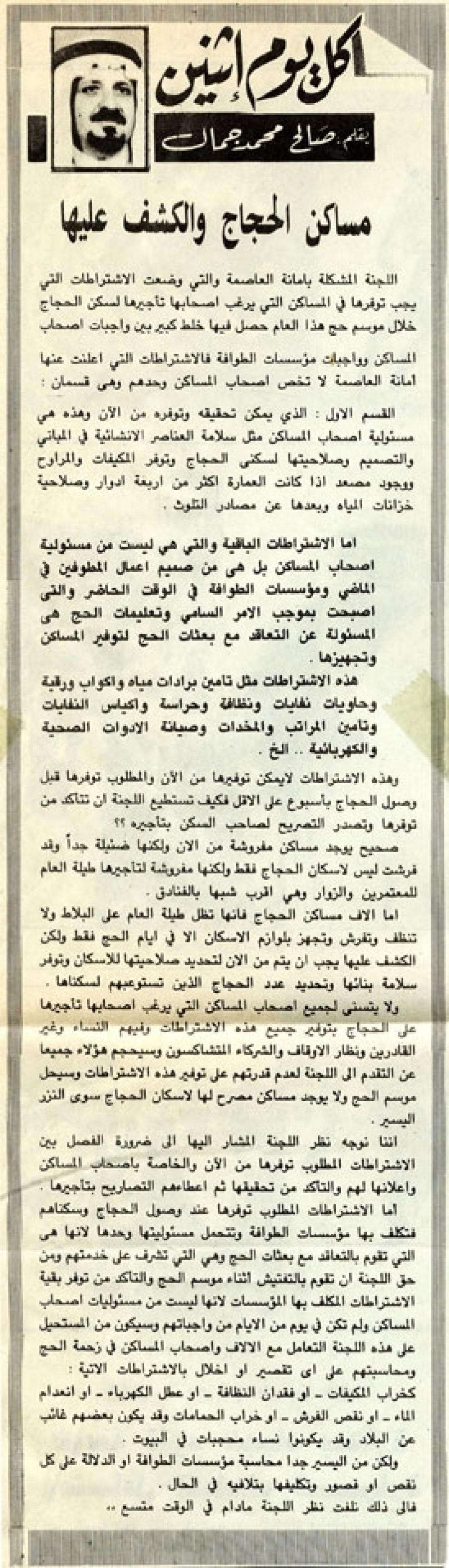 أما آلاف مساكن الحجاج فأنها تظل طيلة العام على البلاط ولا تنظف وتفرش وتجهز بلوازم الإسكان إلا في أيام الحج فقط ولكن الكشف عليها يجب أن يتم من الآن لتحديد صلاحيتها للإسكان وتوفر سلامة بنائها وتحديد عدد الحجاج الذين تستوعبهم لسكناها.
