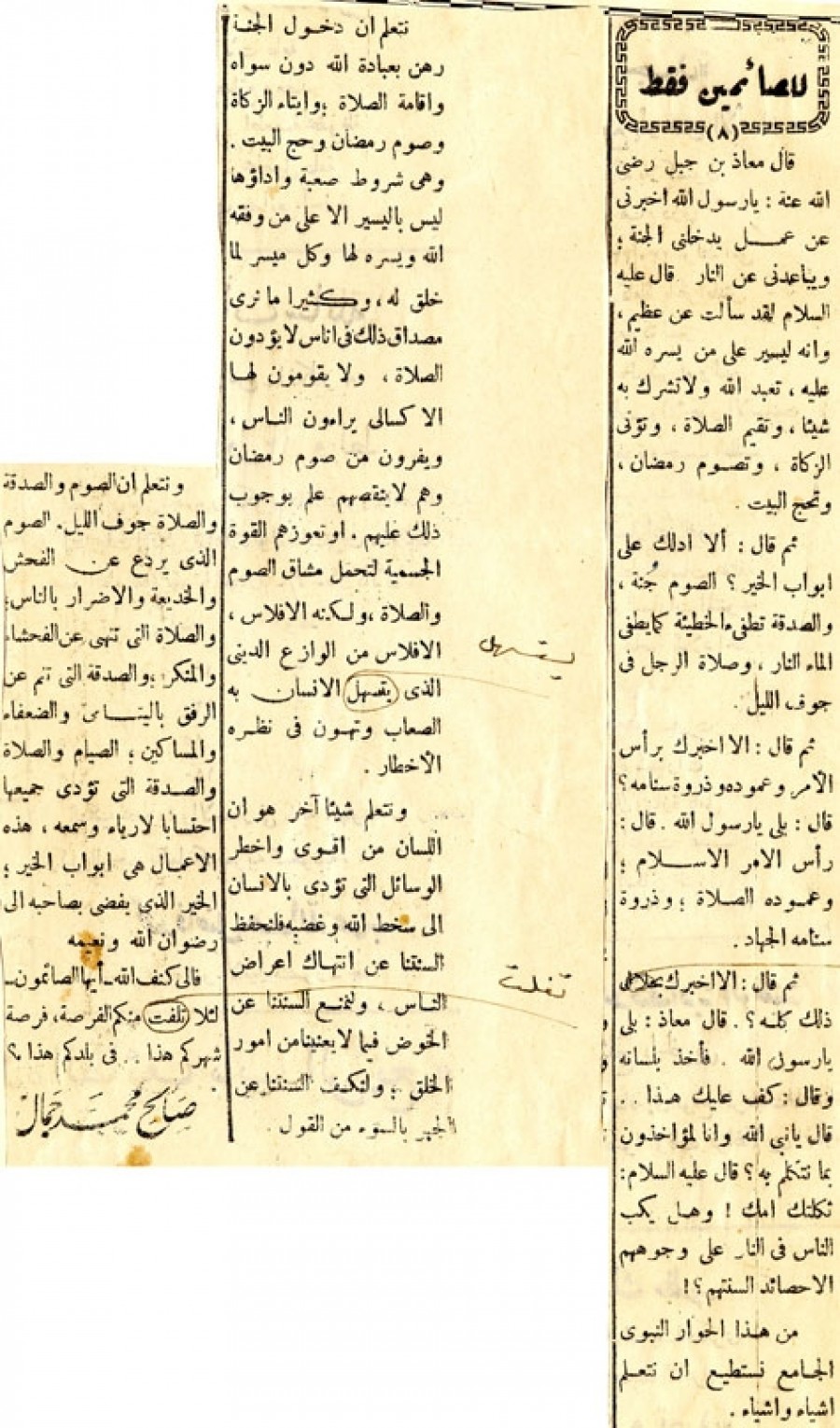 قال معاذ بن جبل رضي الله عنه: يا رسول الله أخبرني عن عمل يدخلني الجنة؛ ويباعدني عن النار قال عليه السلام لقد سألت عن عظيم، وأنه ليسير على من يسره الله عليه، تعبد الله ولا تشرك به شيئاً، وتقيم الصلاة، وتؤتى الزكاة، وتصوم رمضان، وتحج البيت. ثم قال: ألا أدلك على أبواب الخير؟ الصوم جنة، والصدقة تطفئ الخطيئة كما يطفئ الماء النار وصلاة الرجل في جوف الليل. ثم قال: ألا أخبرك برأس الأمر وعموده وذروة سنامه؟ قال: بلى يا رسول الله قال: رأس الأمر الإسلام؛ وعموده الصلاة؛ وذروة سنامه الجهاد. ثم قال: ألا أخبرك بملاك ذلك كله؟ قال معاذ: بلى يا رسول الله فأخذ بلسانه وقال: كف عليك هذا.. قال يا نبي الله وإنا لمؤاخذون بما نتكلم به؟ قال عليه السلام: ثكلتك أمك ! وهل يكب الناس في النار على وجوههم إلا حصائد ألسنتهم؟! من هذا الحوار النبوي الجامع نستطيع أن نتعلم أشياء وأشياء. نتعلم أن دخول الجنة رهن بعبادة الله دون سواه وإقامة الصلاة؛ وإيتاء الزكاة وصوم رمضان وحج البيت. وهي شروط صعبة وأداؤها ليس باليسير إلا على من وفقه الله ويسره لها وكل ميسر لما خلق له، وكثيراً ما نرى مصداق ذلك في أناس لا يؤدون الصلاة، ولا يقومون لها إلا كسالى يراءون الناس ويفرون من صوم رمضان وهم لا ينقصهم علم بوجوب ذلك عليهم. أو تعوزهم القوة الجسمية لتحمل مشاق الصوم والصلاة، ولكنه الإفلاس من الوازع الديني الذي يستسهل الإنسان به الصعاب وتهون في نظره الأخطار. ونتعلم شيئاً آخر هو أن اللسان من أقوى وأخطر الوسائل التي تؤدى بالإنسان إلى سخط الله وغضبه فلنحفظ ألسنتنا عن انتهاك أعراض الناس، ولنمنع ألسنتنا عن الخوض فيما لا يعنينا من أمور الخلق؛ ولنكف ألسنتنا عن الجهر بالسوء من القول. ونتعلم إن الصوم والصدقة والصلاة جوف الليل. الصوم الذي يردع عن الفحش والخديعة والإضرار بالناس والصلاة التي تنهي عن الفحشاء والمنكر؛ والصدقة التي تنم عن الرفق باليتامى والضعفاء والمساكين؛ الصيام والصلاة والصدقة التي تؤدى جميعها احتسابا لا رياء وسمعه، هذه الأعمال هي أبواب الخير؛ الذي يفضى بصاحبه إلى رضوان الله ونعيمه. فإلى كنف الله- أيها الصائمون لئلا تفلت منكم فرصة شهركم هذا.. في بلدكم هذا؟.