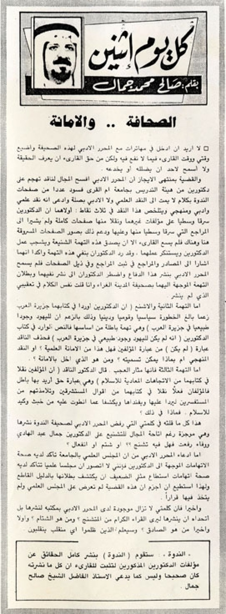 "الندوة":ستقوم (الندوة) بنشر كامل الحقائق عن مؤلفات الدكتورين المذكورين لتثبت للقارئ أن كل ما نشرته كان صحيحا وليس كما يدعي الأستاذ الفاضل الشيخ صالح جمال.