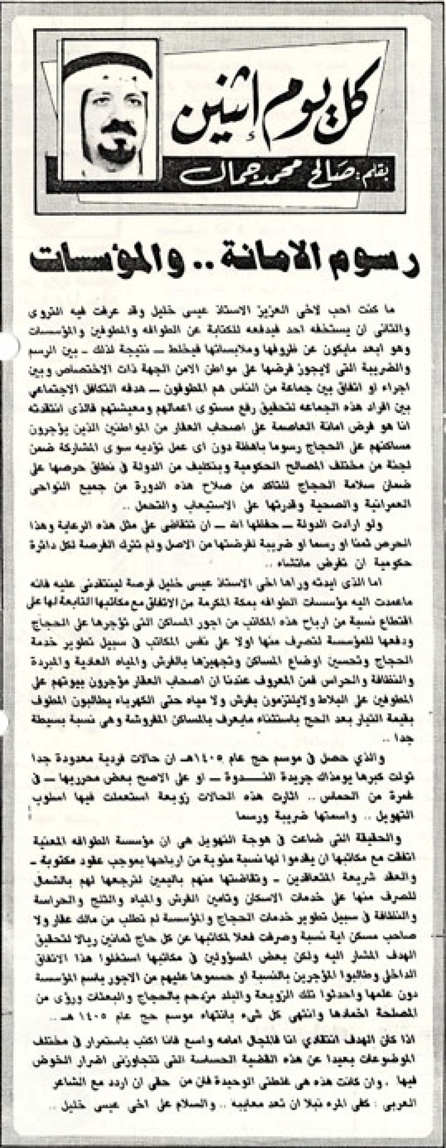 ما كنت أحب لأخي العزيز الأستاذ عيسي خليل وقد عرفت فيه التروي والتأني أن يستخفه أحد فيدفعه للكتابة عن الطوافة والمطوفين والمؤسسات وهو أبعد ما يكون عن ظروفها وملابساتها فيخلط-نتيجة لذلك-بين الرسم والضريبة التي لا يجوز فرضها على مواطن الأمن الجهة ذات الاختصاص وبين إجراء أو اتفاق بين جماعة من الناس هم المطوفون-هدفه التكافل الاجتماعي بين أفراد هذه الجماعة لتحقيق رفع مستوي أعمالهم ومعيشتهم فالذي انتقدته أنا هو فرض أمانه العاصمة على أصحاب العقار من المواطنين الذي يؤجرون مساكنهم على الحجاج رسوما باهظة دون أي عمل تؤديه سوي المشاركة ضمن لجنة من مختلف المصالح الحكومية وبتكليف من الدولة في نطاق حرصها على ضمان سلامة الحجاج للتأكد من صلاح هذه الدورة من جميع النواحي العمرانية والصحية وقدرتها على الاستيعاب والتحمل..