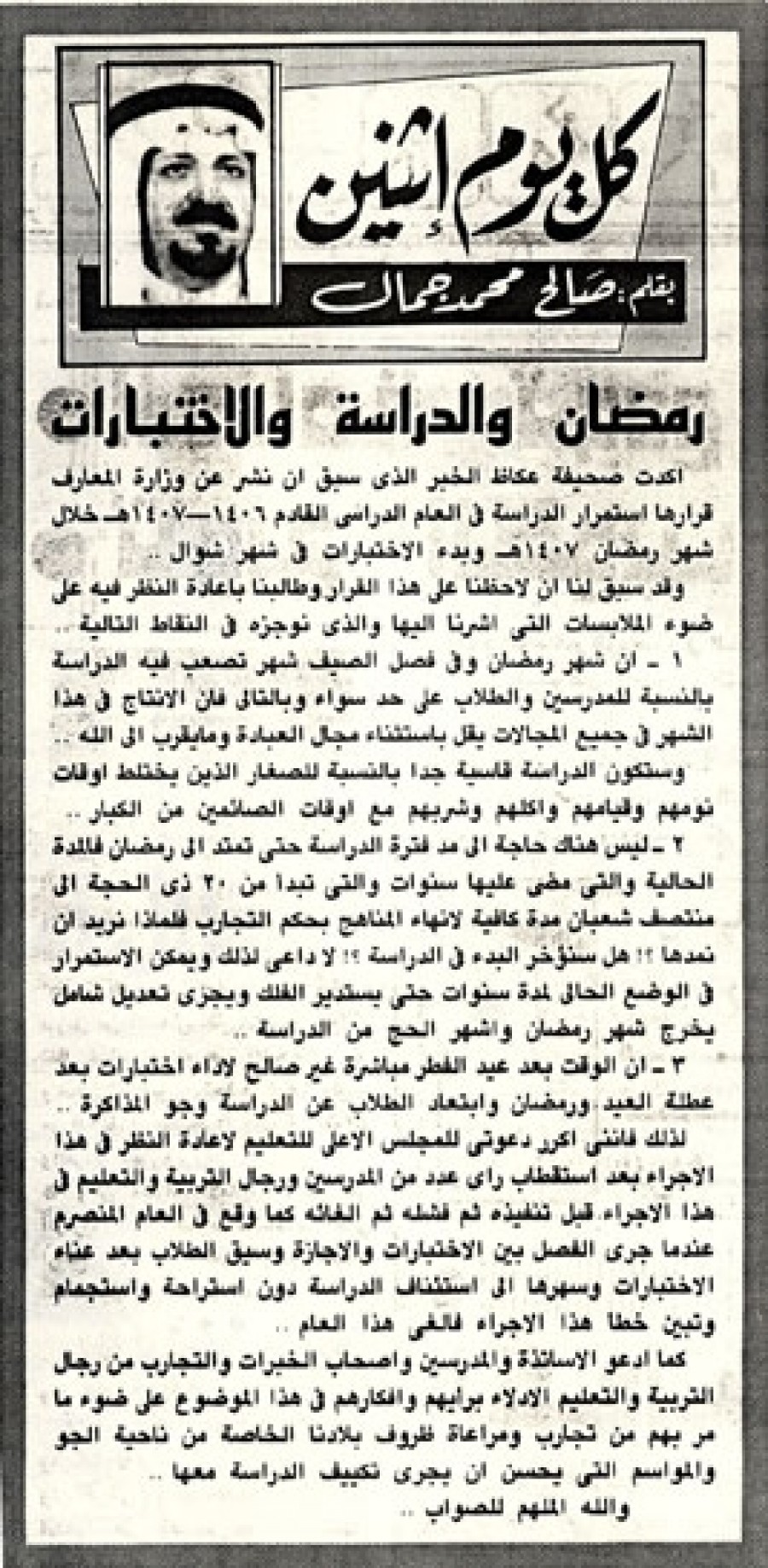 لذلك فإنني أكرر دعوتي للمجلس الأعلي للتعليم لإعادة النظر في هذا الإجراء بعد استقطاب راي عدد من المدرسين ورجال التربية والتعليم في هذا الإجراء قبل تنفيذه ثم فشله ثم إلغائه كما وقع في العام المنصرم عندما جرى الفصل بين الاختبارات والإجازة وسيق الطلاب بعد عناء الاختبارات وسهرها الي استئناف الدراسة دون استراحة واستجمام وتبين خطأ هذا الإجراء فألغي هذا العام.