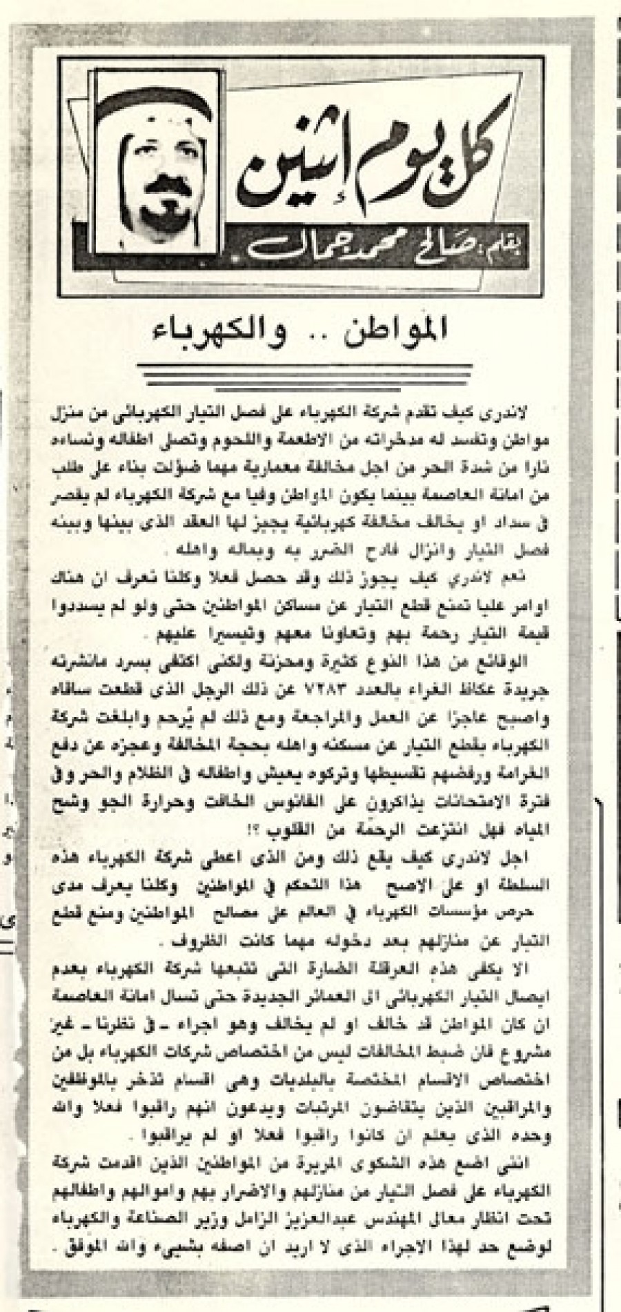 إنني أضع هذه الشكوى المريرة من المواطنين الذين أقدمت شركة الكهرباء على فصل التيار من منازلهم والإضرار بهم وأموالهم وأطفالهم تحت أنظار معالي المهندس عبد العزيز الزامل وزير الصناعة والكهرباء لوضع حد لهذا الإجراء الذي لا أريد أن أصفه بشيئ والله الموفق