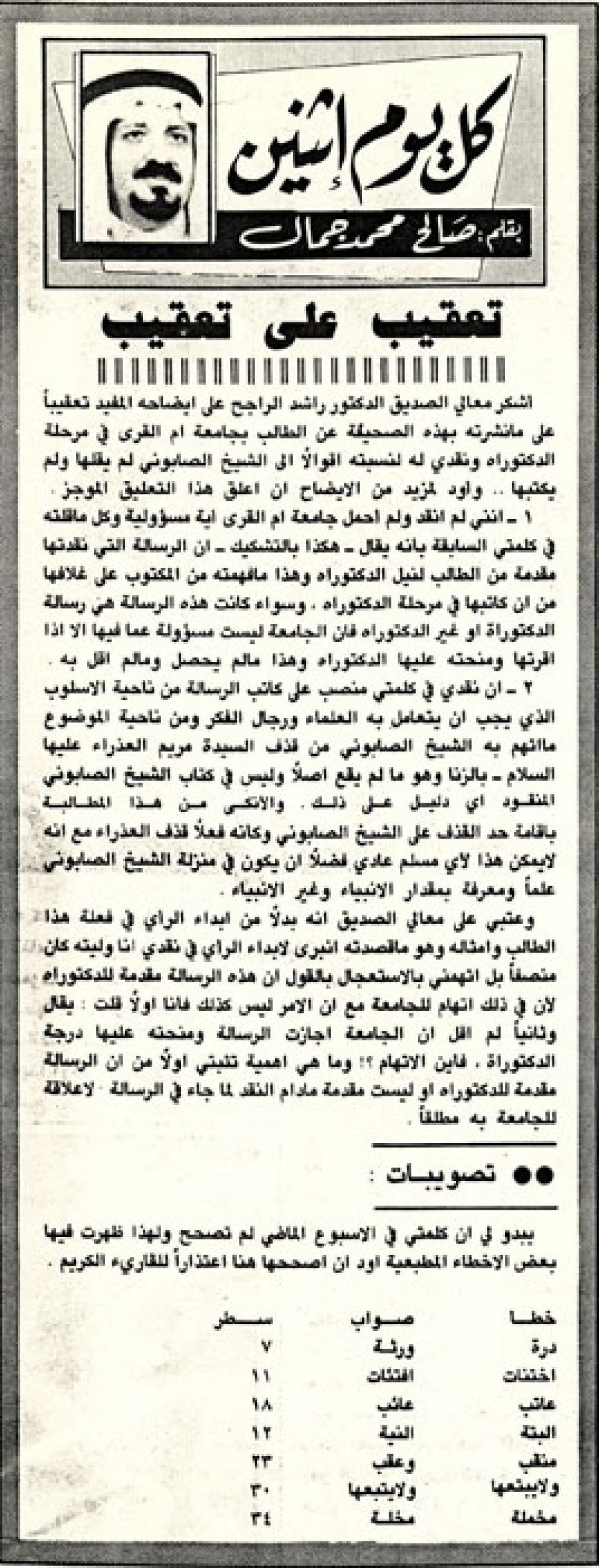 أشكر معالي الصديق الدكتور راشد الراجح على إيضاحه المفيد تعقيباً على ما نشرته بهذه الصحيفة عن الطالب بجامعة أم القرى في مرحلة الدكتوراه ونقدي له لنسبته أقوالاً إلي الشيخ الصابوني لم يقلها ولم يكتبها.. وأود لمزيد من الأيضاح أن أعلق هذا التعليق الموجز.