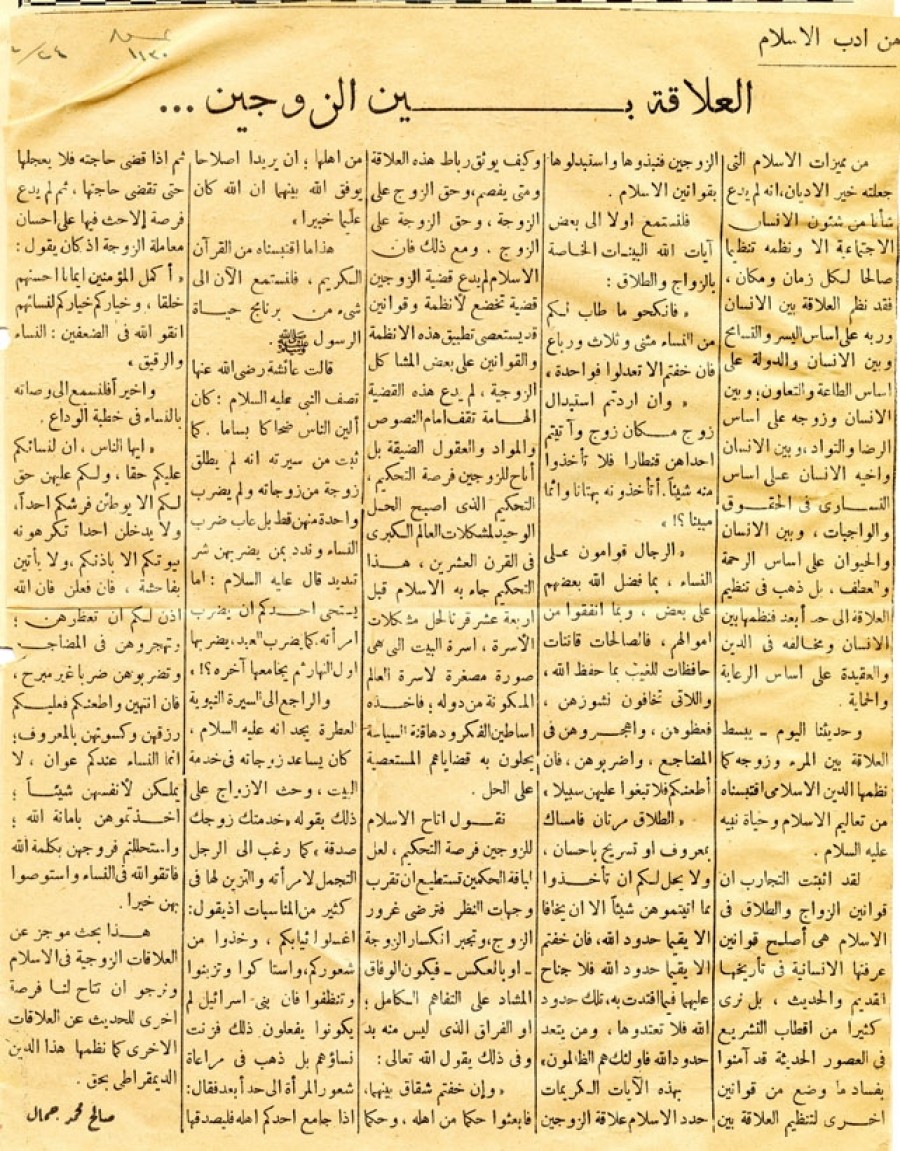 من مميزات الإسلام التي جعلته خير الأديان، أنه لم يدع شأناً من شئون الإنسان الاجتماعية إلا ونظمه تنظيماً صالحاً لكل زمان ومكان، فقد نظم العلاقة بين الإنسان وربه على أساس اليسر والتسامح وبين الإنسان والدولة على أساس الطاعة والتعاون؛ وبين الإنسان وزوجه على أساس الرضا والتواد، وبين الإنسان وأخيه الإنسان على أساس التساوي في الحقوق والواجبات، وبين الإنسان والحيوان على أساس الرحمة والعطف، بل ذهب في تنظيم العلاقة إلى حد أبعد فنظمها بين الإنسان ومخالفه في الدين والعقيدة على أساس الرعاية والحماية. وحديثنا اليوم - يبسط العلاقة بين المرء وزوجه كما نظمها الدين الإسلامي أقتبسناه من تعاليم الإسلام وحياة نبيه عليه السلام. لقد أثبتت التجارب أن قوانين الزواج والطلاق في الإسلام هي أصلح قوانين عرفتها الإنسانية في تاريخها القديم والحديث، بل نرى كثيراً من أقطاب التشريع في العصور الحديثة قد آمنوا بفساد ما وضع من قوانين أخرى لتنظيم العلاقة بين الزوجين فنبذها واستبدلوها بقوانين الإسلام. فلنستمع أولاً إلى بعض آيات الله البينات الخاصة بالزواج والطلاق: «فانكحو ما طاب لكم من النساء مثنى وثلاث ورباع فإن خفتم ألا تعدلوا فواحدة » «وإن أردتم استبدال زوج مكان زوج وآتيتم أحداهن قنطاراً فلا تأخذوا منه شيئاً. أتأخذونه بهتانا وإثماً مبيناً»؟! «الرجال قوامون على النساء بما فضل الله بعضهم على بعض، وبما أنفقوا من أموالهم، فالصالحات قانتات حافظات للغيب بما حفظ الله، واللاتي تخافون نشوزهن، فعظوهن، واهجروهن في المضاجع، واضربوهن، فإن أطعنكم فلا تبغوا عليهن سبيلاً». «الطلاق مرتان فإمساك بمعروف أو تسريح بإحسان، ولا يحل لكم أن تأخذوا مما أتيتموهن شيئاً إلا أن يخافا ألا يقيما حدود الله، فإن خفتم ألا يقيما حدود الله فلا جناح عليهما فيما افتدت به، تلك حدود الله فلا تعتدوها، ومن يتعد حدود الله فأولئك هم الظالمون». بهذه الآيات الكريمات حدد الإسلام علاقة الزوجين وكيف يوثق رباط هذه العلاقة ومتى يفصم، وحق الزوج على الزوجة، وحق الزوجة على الزوج، ومع ذلك فإن الإسلام لم يدع قضية الزوجين قضية تخضع لأنظمة وقوانين قد يستعصى تطبيق هذه الأنظمة والقوانين على بعض المشاكل الزوجية، لم يدع هذه القضية الهامة، تقف أمام النصوص والمواد والعقول الضيقة بل أتاح للزوجين فرصة التحكيم، التحكيم الذي أصبح الحل الوحيد لمشكلات العالم الكبرى في القرن العشرين، هذا التحكيم جاء به الإسلام قبل أربعة عشر قرناً لحل مشكلات الأسرة، أسرة البيت التي هي صورة مصغرة لأسرة العالم المكونة من دوله؛ فأخذه أساطين الفكر ودهاقنة السياسة يحلون به قضاياهم المستعصية على الحل. نقول أتاح الإسلام للزوجين فرصة التحكيم، لعل لباقة الحكمين تستطيع أن تقرب وجهات النظر فترضى غرور الزوج، وتجبر وانكسار الزوجة - أو بالعكس - فيكون الوفاق المشاد على التفاهم الكامل؛ أو الفراق الذي ليس منه بد وفي ذلك يقول الله تعالى: «وإن خفتم شقاق بينهما فابعثوا حكماً من أهله، وحكماً من أهلها؛ إن يريدا إصلاحاً يوفق الله بينهما إن الله كان عليماً خبيراً». هذا ما اقتبسناه من القرآن الكريم، فلنستمع الآن إلى شيء من برنامج حياة الرسول -صلى الله عليه وسلم-. قالت عائشة - رضي الله عنها - تصف النبي - عليه السلام-: كان ألين الناس ضحاكاً بساماً. كما ثبت من سيرته أنه لم يطلق زوجة من زوجاته ولم يضرب واحدة منهن قط بل عاب ضرب النساء وندد بمن يضربهن شر تمديد قال - عليه السلام-: أما يستحى أحدكم أن يضرب امرأته. كما يضرب العبد، يضربها أول النهار ثم يجامعها آخره؟! والراجع إلى السيرة النبوية العطرة يجد أنه -عليه السلام- كان يساعد زوجاته في خدمة البيت، وحث الأزواج على ذلك بقوله "خدمتك زوجك صدقة" كما رغب إلى الرجل التجمل لامرأته والتزين لها في كثير من المناسبات إذ يقول: اغسلوا ثيابكم، وخذوا من شعوركم، وأستاكوا وتزينوا وتنظفوا فإن بني إسرائيل لم يكونوا يفعلون ذلك فزنت نساؤهم بل ذهب في مراعاة شعور المرأة 