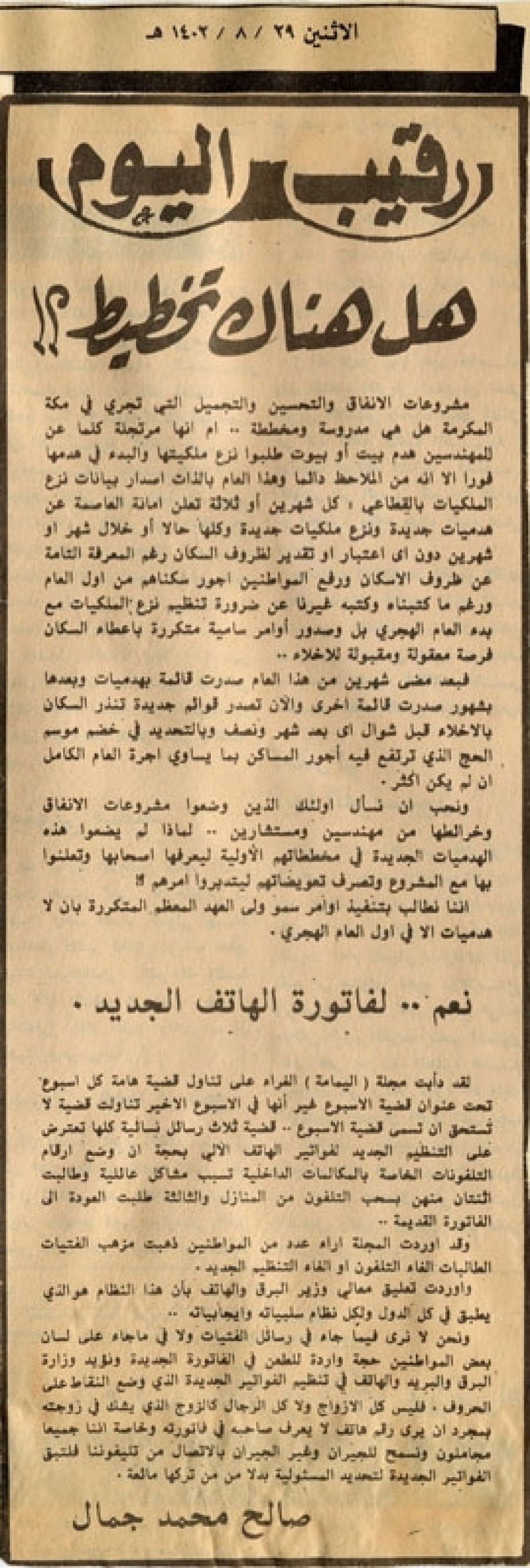 فبعد مضي شهرين من هذا العام صدرت قائمة بهدميات وبعدها بشهور صدرت قائمة أخرى والآن تصدر قوائم جديدة تنذر السكان بالإخلاء قبل شوال أي بعد شهر ونصف وبالتحديد في خضم موسم الحج الذي ترتفع فيه أجور المساكن بما يساوي أجرة العام الكامل إن لم يكن أكثر.