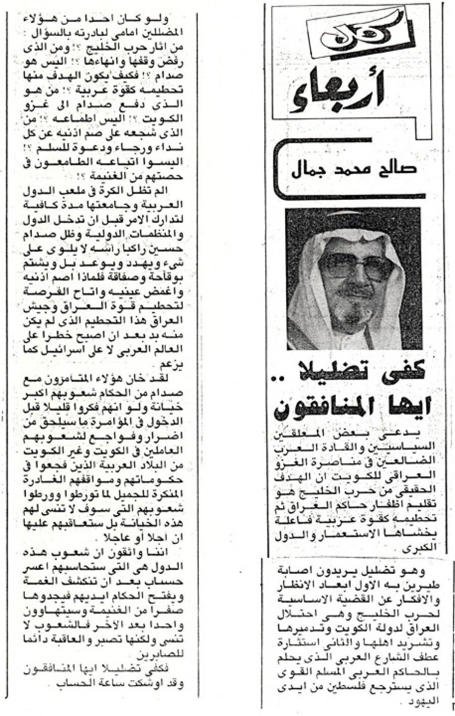 يدعى بعض المعلقين السياسيين والقادة العرب الضالعين في مناصرة الغزو العراقي للكويت أن الهدف الحقيقي من حرب الخليج هو تقليم أظفار حاكم العراق ثم تحطيمه كقوة عربية فاعلة يخشاها الاستعمار والدول الكبرى. وهو تضليل يريدون إصابة طيرين به الأول إبعاد الأنظار والأفكار عن القضية الأساسية لحرب الخليج وهى احتلال العراق لدولة الكويت وتدميرها وتشريد أهلها والثاني استثارة عطف الشارع العربي الذي يحلم بالحاكم العربي المسلم القوي الذي يسترجع فلسطين من أيدي اليهود. ولو كان أحدا من هؤلاء المضللين أمامي لبادرته بالسؤال: من أثار حرب الخليج؟! ومن الذي رفض وقفها وإنهاءها؟! أليس هو صدام؟! فكيف يكون الهدف منها تحطيمه كقوة عربية؟! من هو الذي دفع صدام إلى غزو الكويت؟! أليس أطماعه؟! من الذي شجعه على صم أذنيه عن كل نداء ورجاء ودعوة للسلم؟! أليسوا أتباعه الطامعون في حصتهم من الغنيمة؟! ألم تظل الكرة في ملعب الدول العربية وجامعتها مدة كافية لتدارك الأمر قبل أن تدخل الدول والمنظمات الدولية وظل صدام حسين راكبا رأسه لا يلوي على شيء ويهدد ويوعد بل ويشتم بوقاحة وصفاقة فلماذا أصم أذنيه وأغمض عينيه وأتاح الفرصة لتحطيم قوة العراق وجيش العراق هذا التحطيم الذي لم يكن منه بد بعد أن أصبح خطرا على العالم العربي لا على إسرائيل كما يزعم. لقد خان هؤلاء المتآمرون مع صدام من الحكام شعوبهم أكبر خيانة ولو أنهم فكروا قليلا قبل الدخول في المؤامرة ما سيلحق من أضرار وفواجع لشعوبهم العاملين في الكويت وغير الكويت من البلاد العربية الذين فجعوا في حكوماتهم ومواقفهم الغادرة المنكرة للجميل لما تورطوا وورطوا شعوبهم التي سوف لا تنسى لهم هذه الخيانة بل ستعاقبهم عليها إن آجلا أو عاجلا. إننا واثقون أن شعوب هذه الدول هي التي ستحاسبهم أعسر حساب بعد أن تنكشف الغمة ويفتح الحكام أيديهم فيجدوها صفرا من الغنيمة وسيتهاوون واحدا بعد الآخر فالشعوب لا تنسى ولكنها تصبر والعاقبة دائما للصابرين. فكفي تضليلا أيها المنافقون وقد أوشكت ساعة الحساب.