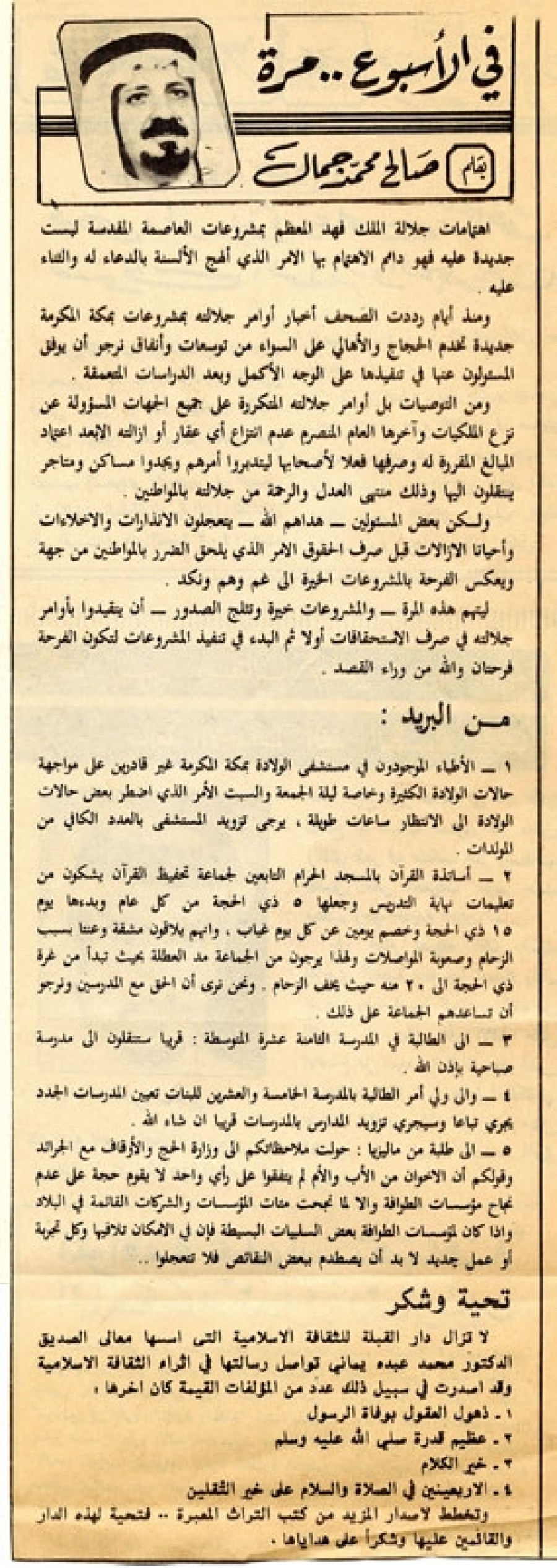 ومنذ أيام رددت الصحف أخبار أوامر جلالته بمشروعات بمكة المكرمة جديدة تخدم الحجاج والأهالي على السواء من توسعات وأنفاق نرجو أن يوفق المسئولون عنها في تنفيذها على الوجه الأكمل وبعد الدراسات المتعمقة.