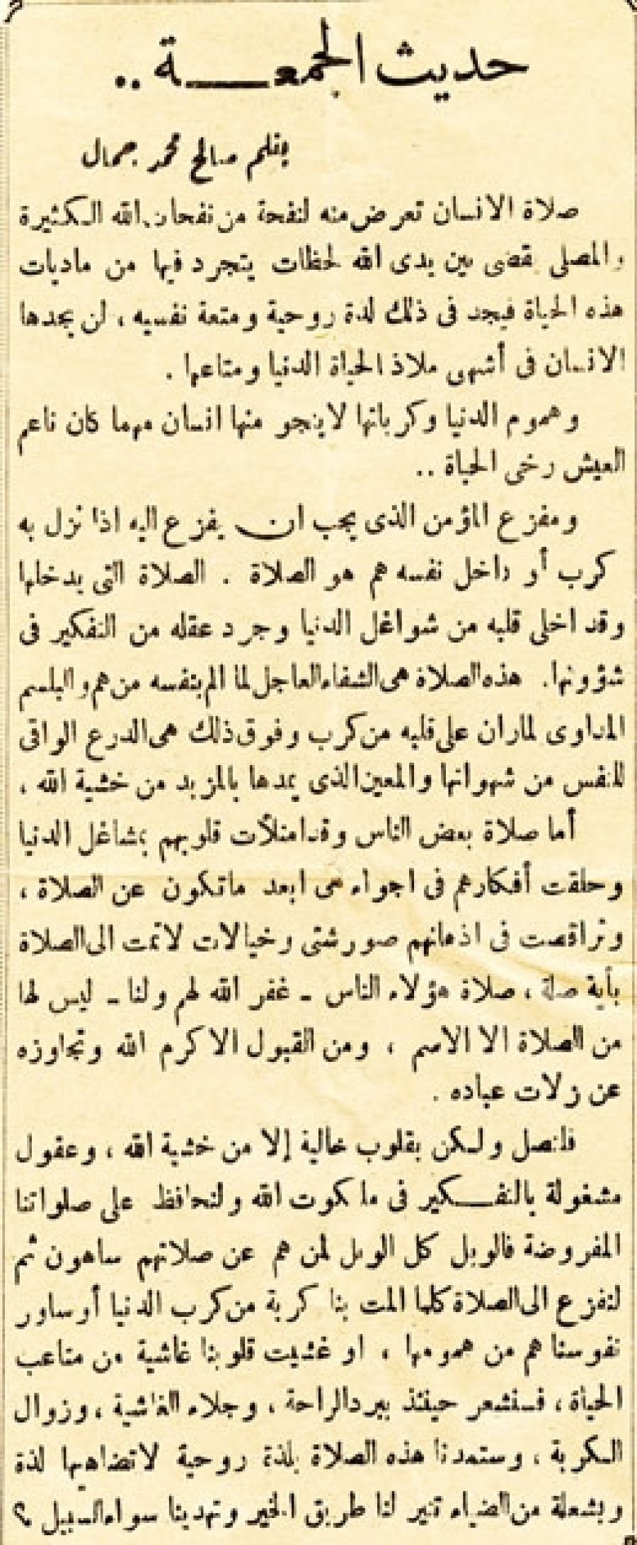 صلاة الإنسان تعرض منه لنفحة من نفحات الله الكثيرة والمصلى يقضى بين يدي الله لحظات يتجرد فيها من ماديات هذه الحياة فيجد في ذلك لذة روحية ومتعة نفسية، لن يجدها الإنسان في أشهى ملاذ الحياة الدنيا ومتاعها. وهموم الدنيا وكرباتها لا ينجو منها إنسان مهما كان ناعم العيش رخي الحياة.. ومفزع المؤمن الذي يجب أن يفزع إليه إذا نزل به كرب أو داخل نفسه هم هو الصلاة. الصلاة التي يدخلها وقد أخلى قلبه من شواغل الدنيا وجرد عقله من التفكير في شئونها. هذه الصلاة هي الشفاء العاجل لما ألم بنفسه من هم والبلسم المداوى لما ران على قلبه من كرب وفوق ذلك هي الدرع الواقي للنفس من شهواتها والمعين الذي يمدها بالمزيد من خشية الله. أما صلاة بعض الناس وقد امتلأت قلوبهم بمشاغل الدنيا وحلقت أفكارهم في أجواء هي أبعد ما تكون عن الصلاة وتراقصت في أذهانهم صور شتى وخيالات لا تمت إلى الصلاة بأية صلة، هؤلاء الناس - غفر الله لهم ولنا - ليس لها من الصلاة إلا الاسم، ومن القبول إلا كرم الله وتجاوزه عن زلات عباده. فلنصل ولكن بقلوب خالية إلا من خشية الله، وعقول مشغولة بالتفكير في ملكوت الله ولنحافظ على صلواتنا المفروضة فالويل كل الويل لمن هم عن صلاتهم ساهون ثم لنفزع إلى الصلاة كلما ألمت بنا كربة من كرب الدنيا أو ساور نفسونا هم من همومها، أو غشيت قلوبنا غاشية من متاعب الحياة، فسنشعر حينئذ ببرد الراحة وجلاء الغاشية، وزوال الكربة، وستمدنا هذه الصلاة بلذة روحية لا تضاهيها لذة وبشعلة من الضياء تنير لنا طريق الخير وتهدينا سواء السبيل.