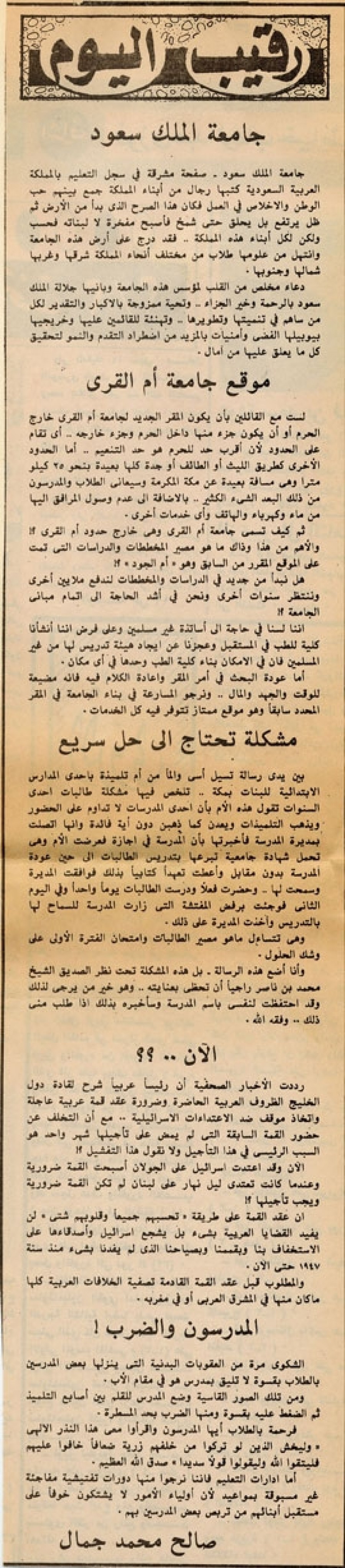 وأنا أضع هذه الرسالة – بل هذه المشكلة تحت نظر الصديق الشيخ محمد بن ناصر راجياً أن تحظى بعنايته.. وهو خير من يرجى لذلك وقد احتفظت لنفسي باسم المدرسة وسأخبره بذلك إذا طلب مني ذلك.. وفقه الله.