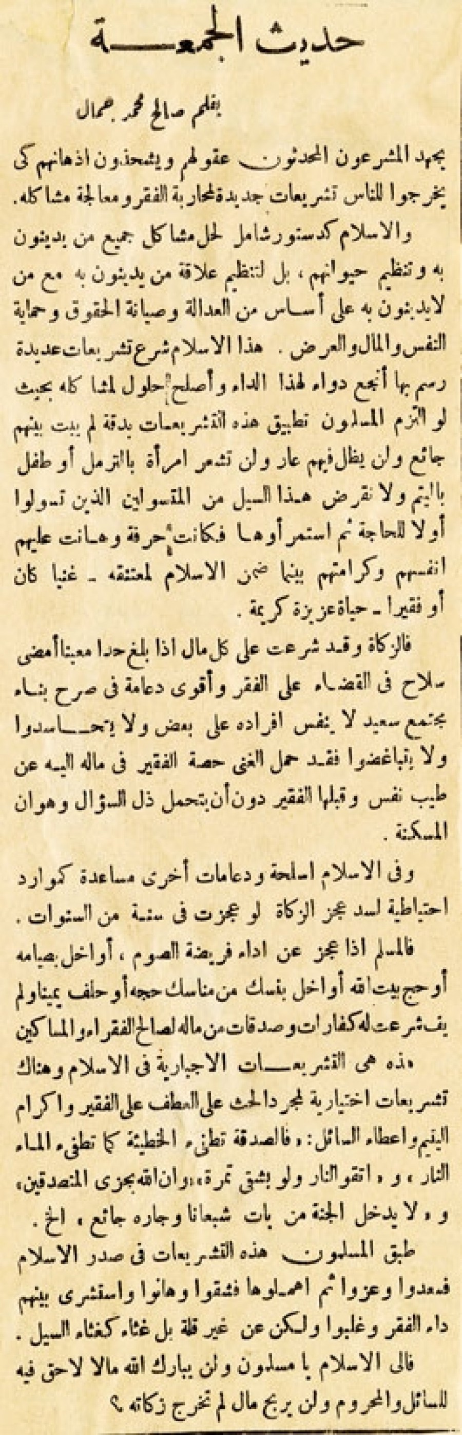 يجهد المشرعون المحدثون عقولهم ويشحذون أذهانهم كي يخرجوا للناس تشريعات جديدة لمحاربة الفقر ومعالجة مشاكله. والإسلام كدستور شامل لحل مشاكل جميع من يدينون به مع من لا يدينون به على أساس من العدالة وصيانة الحقوق وحماية النفس والمال والعرض. هذا الإسلام شرع تشريعات عديدة رسم بها أنجح دواء لهذا الداء وأصلح حلول لمشاكله بحيث لو التزم المسلمون تطبيق هذه التشريعات بدقة لم يبت بينهم جائع ولن يظل فيهم عار ولن تشعر إمرأة بالترمل أو طفل باليتم ولا نقرض هذا السيل من المتسولين الذين تسولوا أولاً للحاجة ثم استمرأوها فكانت حرفة وهانت عليهم أنفسهم وكرامتهم بينما ضمن الإسلام لمعتنقه - غنياً كان أو فقيراً - حياة عزيزة كريمة. فالزكاة وقد شرعت على كل مال إذا بلغ حداً معيناً أمضى سلاح في القضاء على الفقر وأقوى دعامة في صرح بناء مجتمع سعيد لا ينفس أفراده على بعض ولا يتحاسدوا ولا يتباغضوا فقد حمل الغنى حصة الفقير في ماله إليه عن طيب نفس وقبلها الفقير دون أن يتحمل ذل السؤال وهوان المسكنة. وفي الإسلام أسلحة ودعامات أخرى مساعدة كموارد احتياطية لسد عجز الزكاة لو عجزت في سنة من السنوات. فالمسلم إذا عجز عن أداء فريضة الصوم، أو أخل بصيامه أو حج بيت الله أو أخل بنسك من مناسك حجه أو حلف يميناً ولم يفي شرعت له كفارات وصدقات من ماله لصالح الفقراء أو المساكين. هذه هي التشريعات الإجبارية في الإسلام وهناك تشريعات اختيارية لمجرد الحث على العطف على الفقير وإكرام اليتيم وإعطاء السائل: فالصدقة تطفئ الخطيئة كما تطفئ الماء النار واتقوا النار ولو بشق تمرة وأن الله يجزى المتصدقين ولا يدخل الجنة من بات شبعاناً وجاره جائع إلخ. طبق المسلمون هذه التشريعات في صدر الإسلام فسعدوا وعزوا ثم أهملوها فشقوا وهانوا واستشرى بينهم داء الفقر وغلبوا ولكن عن غير قلة بل غثاء كغثاء السيل. فإلى الإسلام يا مسلمون ولن يبارك الله مالا لا حق فيه للسائل والمحروم ولن يربح مال لم تخرج زكاته؟