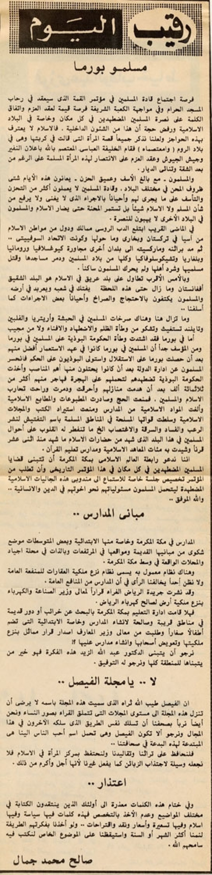 إن الفيصل طيب الله ثراه الذي سميت هذه المجلة باسمه لا يرضى أن تنزل هذه المجلة إلى مستوى المجلات التي تتملق القراء بصور النساء ونحن أيضا نربأ بصحفنا أن تسلك نفس الطريق الذي سلكه الآخرون في هذا المجال ونرجو ألا تكون الفيصل وهي تحمل اسم أحب الناس إلينا هي المبتدعة لهذه البدعة في صحافتنا..