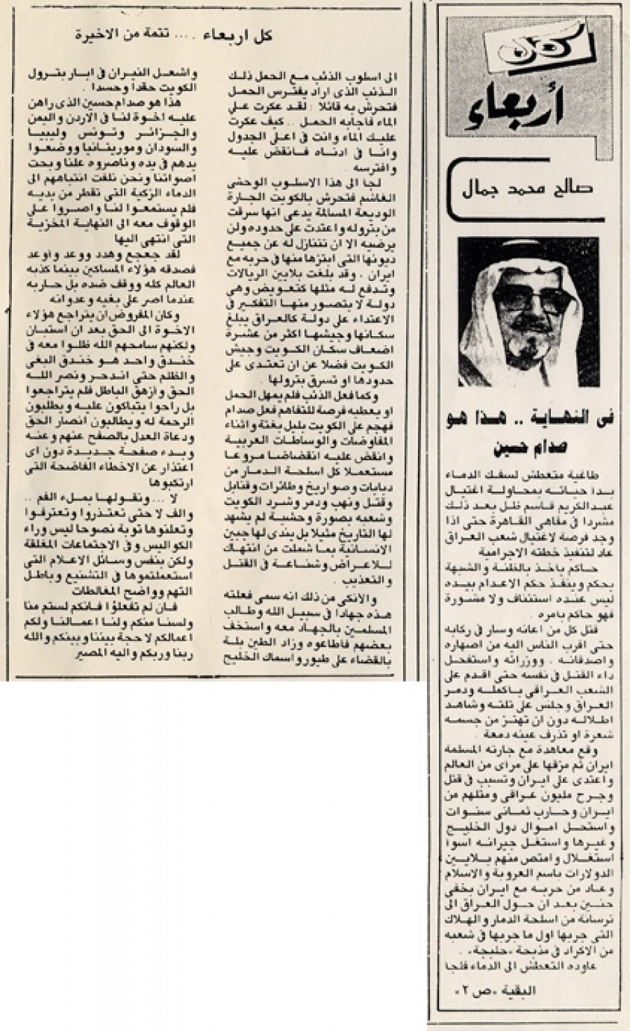 طاغية متعطش لسفك الدماء بدأ حياته بمحاولة اغتيال عبد الكريم قاسم ظل بعد ذلك مشردا في مقاهي القاهرة حتى إذا وجد فرصة لاغتيال شعب العراق عاد لتنفيذ خطته الإجرامية. حاكم يأخذ بالظنة والشبهة يحكم وينفذ حكم الإعدام بيده ليس عنده استئناف ولا مشورة فهم حاكم بأمره. قتل كل من أعانه وسار في ركابه حتى أقرب الناس إليه من أصهاره وأصدقائه. ووزرائه واستفحل داء القتل في نفسه حتى أقدم على الشعب العراقي بأكمله ودمر العراق وجلس على تلته وشاهد أطلاله دون أن تهتز من جسمه شعرة أو تذرف عينه دمعة. وقع معاهدة مع جارته المسلمة إيران ثم مزقها على مرآي من العالم واعتدى على إيران وتسبب في قتل وجرح مليون عراقي ومثلهم من إيران وحارب ثماني سنوات واستحل أموال دول الخليج وغيرها واستغل جيرانه أسوأ استغلال وامتص منهم بلايين الدولارات باسم العروبة والإسلام وعاد من حربه مع إيران بخفي حنين بعد أن حول العراق إلى ترسانة من أسلحة الدمار والهلاك التي جربها أول ما جربها في شعبه من الأكراد في مذبحة "حلبجة". عاوده التعطش إلى الدماء فلجأ إلى أسلوب الذئب مع الحمل ذلك الذئب الذي أراد أن يفترس الحمل فتحرش به قائلا: لقد عكرت على الماء فأجابه الحمل.. كيف عكرت عليك الماء وأنت في أعلى الجدول وأنا في أدناه فانقض عليه وافترسه. لجأ إلى هذا الأسلوب الوحشي الغاشم فتحرش بالكويت الجارة الوديعة المسالمة يدعي أنها سرقت من بتروله واعتدت على حدوده ولن يرضيه إلا أن تتنازل له عن جميع ديونها التي ابتزها منها في حربه مع إيران، وقد بلغت بلايين الريالات وتدفع له مثلها كتعويض وهي دولة لا يتصور منها التفكير في الاعتداء على دولة كالعراق يبلغ سكانها وجيشها أكثر من عشرة أضعاف سكان الكويت وجيش الكويت فضلا عن أن تعتدي على حدودها أو تسرق بترولها. وكما فعل الذئب فلم يمهل الحمل أو يعطيه فرصة للتفاهم فعل صدام فهجم على الكويت بليل بغتة وأثناء المفاوضات والوساطات العربية وانقض عليه انقضاضا مروعا مستعملا كل أسلحة الدمار من دبابات وصواريخ وطائرات وقنابل وقتل ونهب ودمر وشرد الكويت وشعبه بصورة وحشية لم يشهد لها التاريخ مثيلا بل يندى لها جبين الإنسانية بما شملت من انتهاك للأعراض وشناعة في القتل والتعذيب. والأنكى من ذلك أنه سمى فعلته هذه جهادا في سبيل الله وطالب المسلمين بالجهاد معه واستخف بعضهم فأطاعوه وزاد الطين بلة بالقضاء على طيور وأسماك الخليج وأشعل النيران في آبار بترول الكويت حقدا وحسدا. هذا هو صداك حسين الذي راهن عله أخوة لنا في الأردن واليمن والجزائر وتونس وليبيا والسودان وموريتانيا ووضعوا يدهم في يده وناصروه علنا وبحت أصواتنا ونحن نلفت انتباههم إلى الدماء الزكية التي تقطر من يديه فلم يستمعوا لنا وأصروا على الوقوف معه إلى النهاية المخزية التي انتهى إليها. لقد جعجع وهدد ووعد وأوعد فصدقه هؤلاء المساكين بينما كذبه العالم كله ووقف ضده بل حاربه عندما أصر على بغيه وعدوانه. وكان المفروض أن يتراجع هؤلاء الأخوة إلى الحق بعد أن استبان ولكنهم سامحهم الله ظلوا معه في خندق واحد هو خندق البغي والظلم حتى اندحر ونصر الله الحق وأزهق الباطل فلم يتراجعوا بل راحوا يتباكون عليه ويطلبون الرحمة له ويطالبون أنصار الحق ودعاة العدل بالصفح عنهم وعنه وبدء صفحة جديدة دون أي اعتذار عن الأخطاء الفاضحة التي ارتكبوها. لا.. ونقولها بملء الفم.. وألف لا حتى تعتذروا وتعترفوا وتعلنوها توبة نصوحا ليس وراء الكواليس وفي الاجتماعات المغلقة ولكن بنفس وسائل الإعلام التي استعملتموها في التشنيع وباطل التهم وواضح المغالطات. فإن لم تفعلوا فإنكم لستم منا ولسنا منكم ولنا أعمالنا ولكم أعمالكم لا حجة بيننا وبينكم والله ربنا وربكم وإليه المصير.