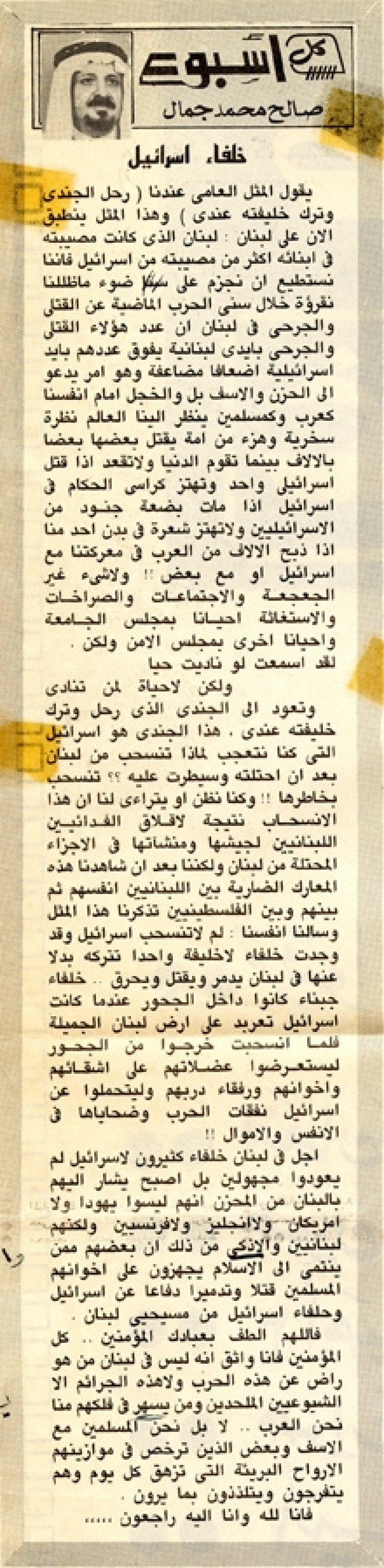 ونعود إلى الجندي الذي رحل وترك خليفته عندي، هذا الجندي هو إسرائيل التي كنا نتعجب لماذا تنسحب من لبنان بعد أن احتلته وسيطرت عليه؟؟ تنسحب بخاطرها!! وكنا نظن أو يتراءى لنا أن هذا الانسحاب نتيجة لإقلاق الفدائيين اللبنانيين لجيشها ومنشآتها في الأجزاء المحتلة من لبنان وكنا بعد أن شاهدنا هذه المعارك الضارية بين اللبنانيين أنفسهم ثم بينهم وبين الفلسطينيين تذكرنا هذا المثل وسألنا أنفسنا: لم لا تنسحب إسرائيل وقد وجدت خلفاء لا خليفة واحدا تتركه بدلا عنها في لبنان يدمر ويقتل ويحرق.. خلفاء جبناء كانوا داخل الجحور عندما كانت إسرائيل تعربد على أرض لبنان الجميلة فلما انسحبت خرجوا من الجحور ليستعرضوا عضلاتهم على أشقائهم وإخوانهم ورفقاء دربهم وليتحملوا عن إسرائيل نفقات الحرب وضحاياها في الأنفس والأموال!!