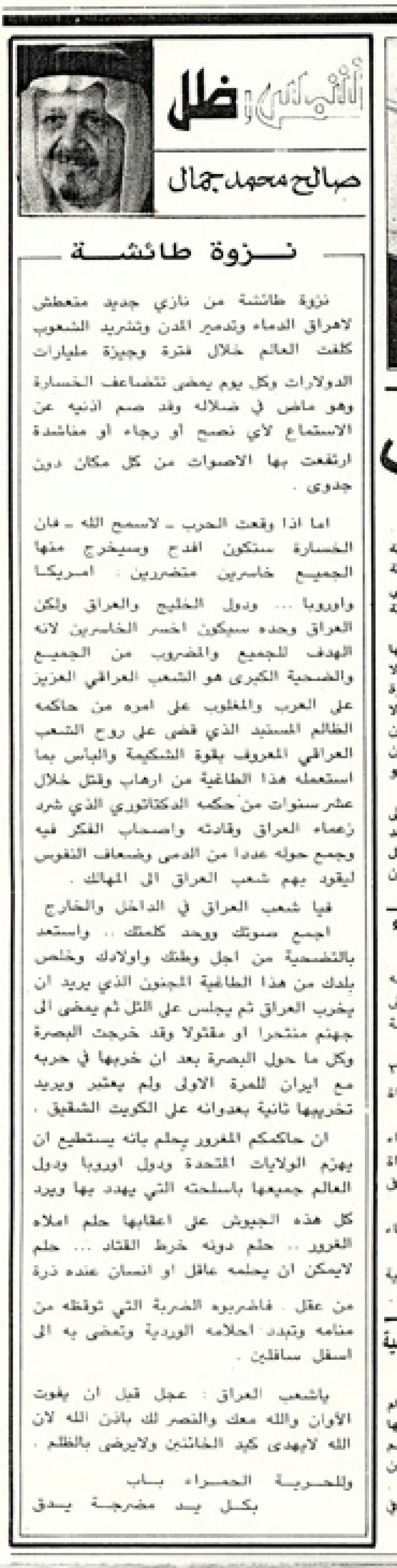 فيا شعب العراق في الداخل والخارج اجمع صوتك ووحد كلمتك.. واستعد بالتضحية من أجل وطنك وأولادك وخلص بلدك من هذا الطاغية المجنون الذي يريد أن يخرب العراق ثم يجلس على التل ثم يمضي إلى جهنم منتحرا أو مقتولا وقد خرجت البصرة وكل ما حول البصرة بعد أن خربها في حربه مع إيران للمرة الأولى ولم يعتبر ويريد تخريبها ثانية بعدوانه على الكويت الشقيق..