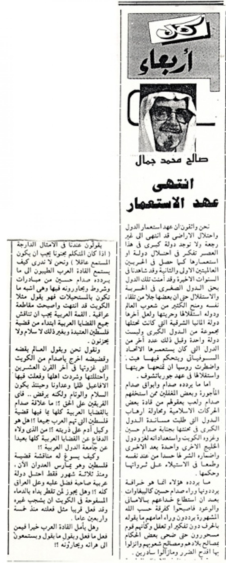 نحن واثقون أن عهد استعمار الدول واحتلال الأراضي قد انتهى إلى غير رجعة ولا توجد دولة كبرى في هذا العصر تفكر في احتلال دولة أو استعمارها كما حصل في الحربين العالميتين الأولى والثانية وقد شاهدنا في السـنوات الأخيرة وقد آمنت تلك الدول بحق الدول الصغرى في الحرية والاستقلال حتى أن بعضها جلا من تلقاء نفسه ومنح الكثير من شعوب العالم ودوله استقلالها وحريتها ولعل آخرها دولة ألمانيا الشرقية التي كانت تحتلها مجموعة من الدول الكبرى وليست دولة واحدة وقبل ذلك عدد آخر من الدول التي كان يستعمرها الاتحاد السوفياتي ويتحكم فيها هبت واضطرت روسيا أن تمنحها حريتها واستقلالها في عهد جورباتشوف. أما ما يردده صدام وأبواق صدام المأجورة وبعض المغفلين ممن استخفهم صدام ولعب بعقولهم من قادة بعض الحركات الإسلامية ومحاولة إرهاب الدول التي طلبت مساندة الدول الكبرى في محنتها بجناية صدام حسين وغزوه الكويت واستعداداته لغزو دول الخليج الأخرى واحدة بعد الأخرى وإضماره الشر لها حسدا من عند نفسه وطمعا في الاستيلاء على ثرواتها وحكمها. ما يردده هؤلاء إنما هو خرافة يرددونها وراء صدام حسين كالببغاوات بعد أن استطاع خداعهم بالأماني والوعود فأصبحوا كفرقة حسب الله المشهورة يرددون وراء إمامهم ما يقوله بالحرف دون تفكير أو تعقل وكأنهم قوم مسحورون حتى ضحى بعض الحكام بمصالح بلادهم ومصالح شعوبهم وأنزلوا بها أفدح الضرر وما زالوا سادرين. يقولون عندنا في الأمثال الدارجة (إذا كان المتكلم مجونا يجب أن يكون المستمع عاقلا) ونحن لا ندري كيف يستمع القادة العرب الطيبون إلى ما يردده صدام حسين من مبادرات وشروط ويحاورونه فيها وهي أشبه ما تكون بالمستحيلات فهو يقول مثلا الكويت قد انتهت وأصبحت مقاطعة عراقية. القمة العربية يجب أن تناقش جميع القضايا العربية ابتداء من قضية فلسطين العتيدة وبغير ذلك لا سلام ولا يحزنون. ونقول نحن ويقول العالم بقضه وقضيضه اخرج يا صدام من الكويت التي غزوتها في آخر القرن العشرين واحتللتها وشردت أهلها وفعلت فيها الأفاعيل ظلما وعدوانا وحينئذ يكون السلام والوئام ولكنه يرفض.. فأي الفريقين على الحق؟! ما علاقة صدام بالقضايا العربية كلها بما فيها قضية فلسطين التي تهم العرب جميعا؟! هل هو وكيل آدم على ذريته؟! من الذي ولاه الدفاع عن القضايا العربية كلها بعيدا عن جامعة الدول العربية؟! وكيف يسوغ له مناقشة قضية فلسطين وهو يمارس العدوان الآن، ومنذ ثلاثة شهور فقط احتل دولة عربية صاحبة فضل عليه وعلى العراق كله؟! وهل يجوز لمن تقطر يداه بالدماء المسفوحة في الكويت أن يشجب غيره وقد فعل قريبا مثل فعلته منذ خمسة وأربعين عاما. وهل يأمل القادة العرب خيرا فيمن فعل ما فعل ويقول ما يقول ويستمعون إلى هرائه ويجارونه؟!
