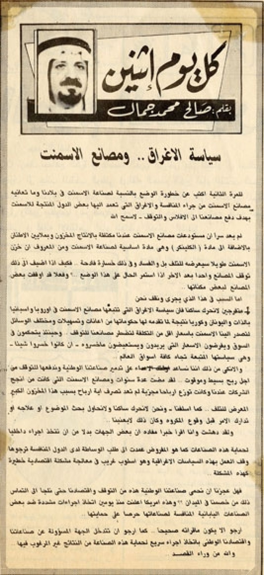 أما السبب في هذا الذي يجري ونقف نحن متفرجين لا نحرك ساكناً فإن سياسة الإغراق التي تتبعها مصانع الأسمنت في أوروبا وأسبانيا بالذات واليونان وكوريا نتيجة لما تقدمه لها حكوماتها من إعانات وتسهيلات ومختلف الوسائل لتصدر إلينا الأسمنت بأسعار أقل من التكلفة لتضطر مصانعنا للتوقف.. وحينئذ يتحكمون في السوق ويفرضون الأسعار التي يريدون ويستعيضون ما خسروه- إن كانوا خسروا شيئاً- وهي سياستها المتبعة تجاه كافة أسواق العالم..