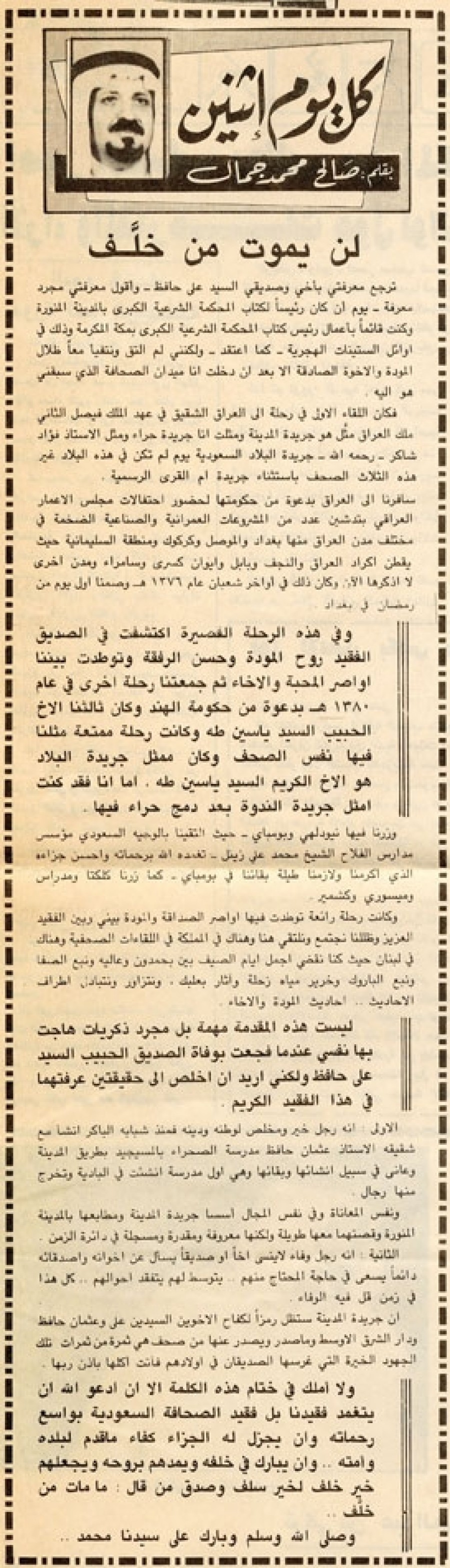 وكانت رحلة رائعة توطدت فيها أواصر الصداقة والمودة بيني وبين الفقيد العزيز وظللنا نجتمع ونلتقي هنا وهناك في المملكة في اللقاءات الصحفية وهناك في لبنان حيث كنا نقضي أجمل أيام الصيف بين بحمدون وعالية ونبع الصفا ونبع الباروك وخرير مياه زحلة وآثار بعلبك، ونتزاور ونتبادل أطراف الأحاديث.. أحاديث المودة والإخاء.