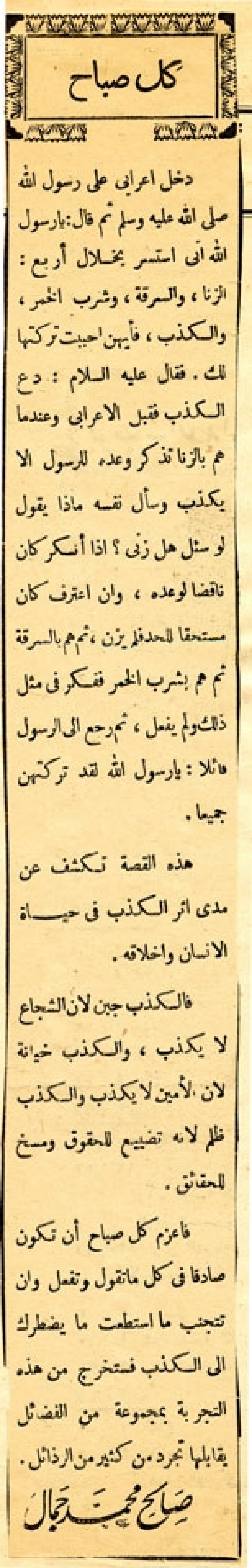 دخل إعرابي على رسول الله - صلى الله عليه وسلم - ثم قال: يا رسول الله إني أستأثر بخلال أربع: الزنا، والسرقة، وشرب الخمر، والكذب، فأيهن أحببت تركتها لك. فقال عليه السلام: دع الكذب فقبل الأعرابي وعندما هم بالزنا تذكر وعده للرسول ألا يكذب وسأل نفسه ماذا يقول لو سئل هل زنى؟ إذا أنكر كان ناقضاً لوعده، وإن أعترف كان مستحقاً للحد فلم يزن، ثم هم بالسرقة ثم هم بشرب الخمر ففكر في مثل ذلك ولم يفعل، ثم رجع إلى الرسول قائلاً: يا رسول الله لقد تركتهن جميعاً. هذه القصة تكشف عن مدى أثر الكذب في حياة الإنسان وأخلاقه. فالكذب جبن لأن الشجاع لا يكذب، والكذب خيانة لأن الأمين لا يكذب والكذب ظلم لأنه تضييع للحقوق ومسخ للحقائق. فأعزم كل صباح أن تكون صادقاً في كل ما تقول وتفعل وأن تتجنب ما استطعت ما يضطرك إلى الكذب فستخرج من هذه التجربة بمجموعة من الفضائل يقابلها تجرد من كثير من الرذائل.